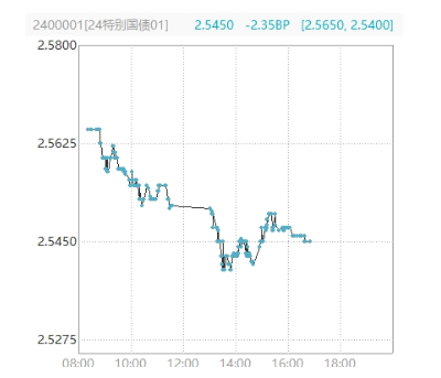深交所“特国2401”(102267.SZ)跌15.91%报100.654元,成交额2195.62万元;上交所“24特国01”(019742.SH)跌0.73%报100.578元,成交额7.22亿元。该债券在银行间市场依旧小幅波动,截止发稿,银行间市场“24特别国债01”(2400001.IB)收益率下行2.35bp报2.545%,成交量为430笔。
