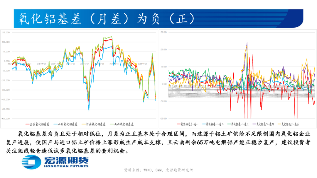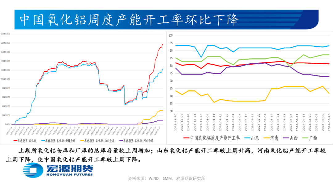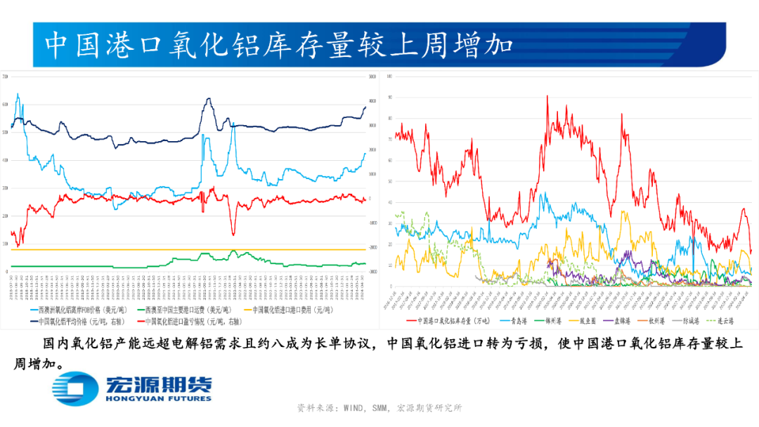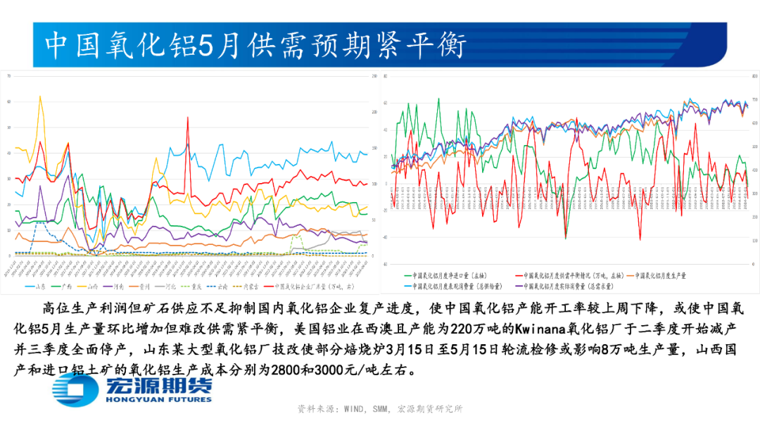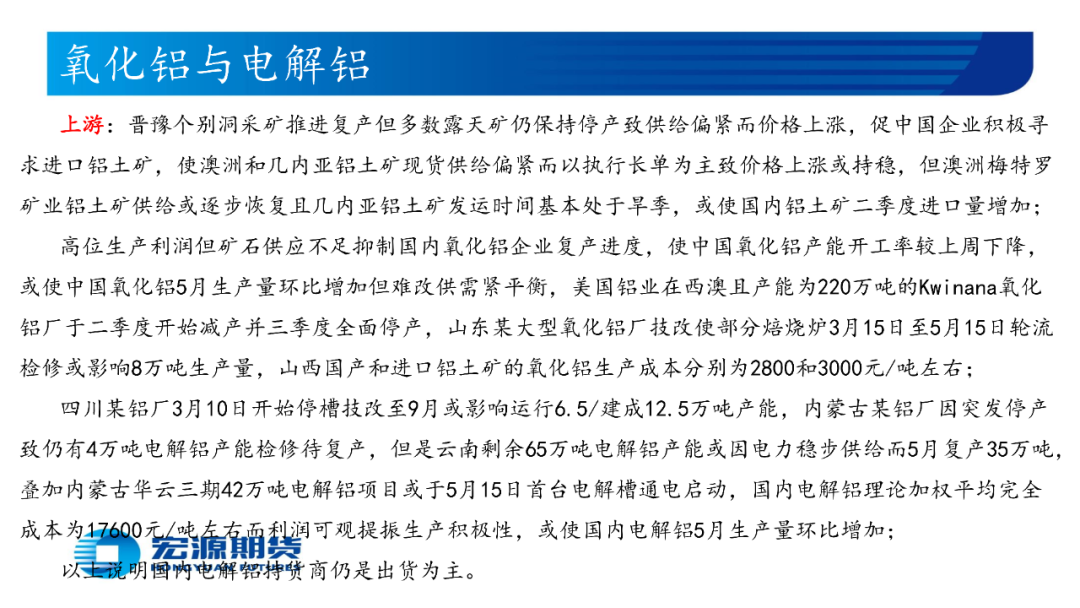 高位生产利润但矿石供应不足抑制国内氧化铝企业复产进度,使中国氧化铝产能开工率较上周下降,或使中国氧化铝5月生产量环比增加但难改供需紧平衡,美国铝业在西澳且产能为220万吨的Kwinana氧化铝厂于二季度开始减产并三季度全面停产,山东某大型氧化铝厂技改使部分焙烧炉3月15日至5月15日轮流检修或影响8万吨生产量,山西国产和进口铝土矿的氧化铝生产成本分别为2800和3000元/吨左右;