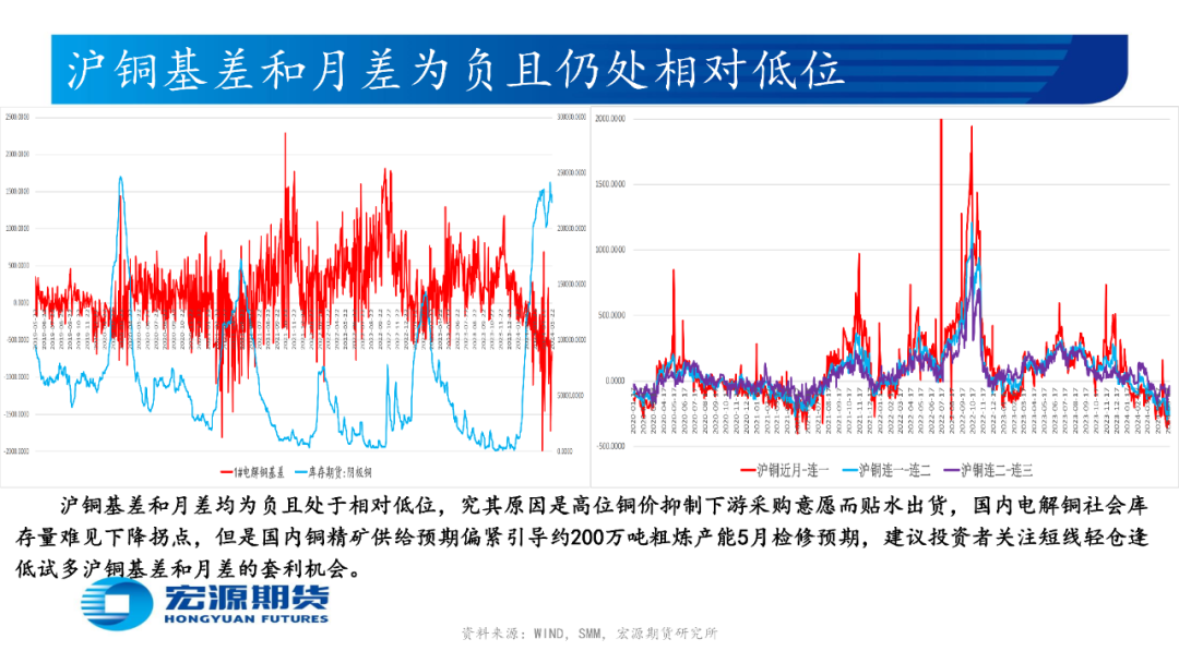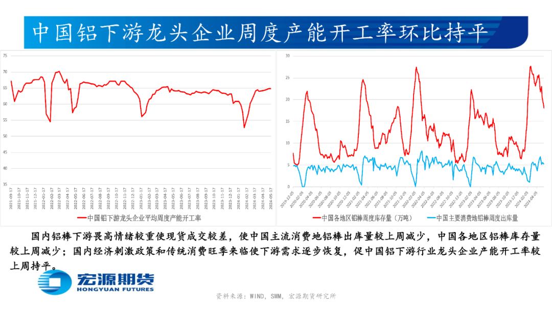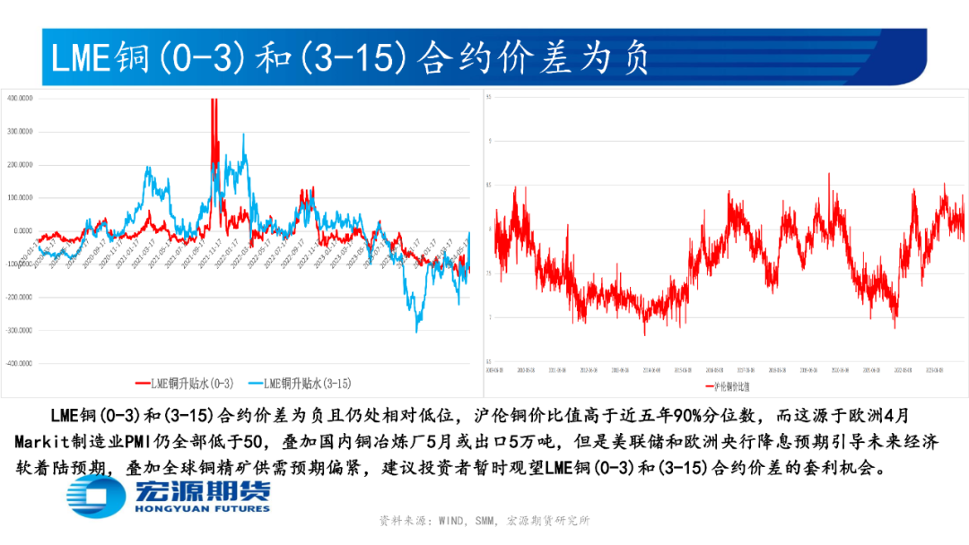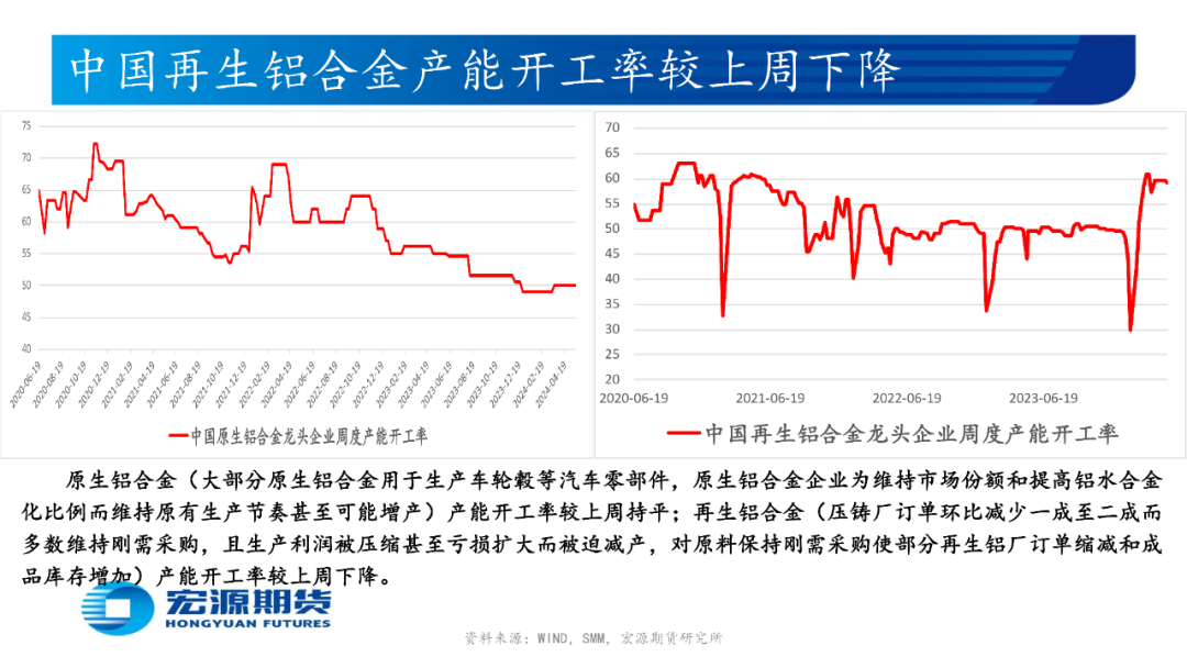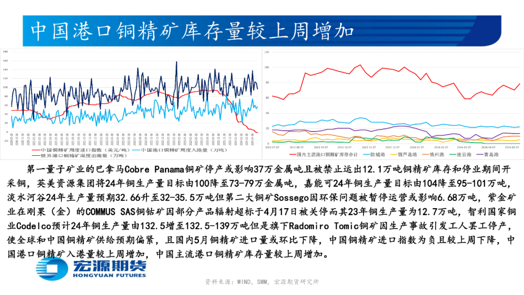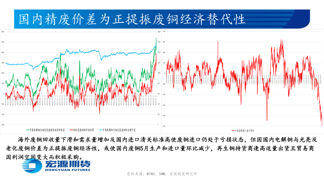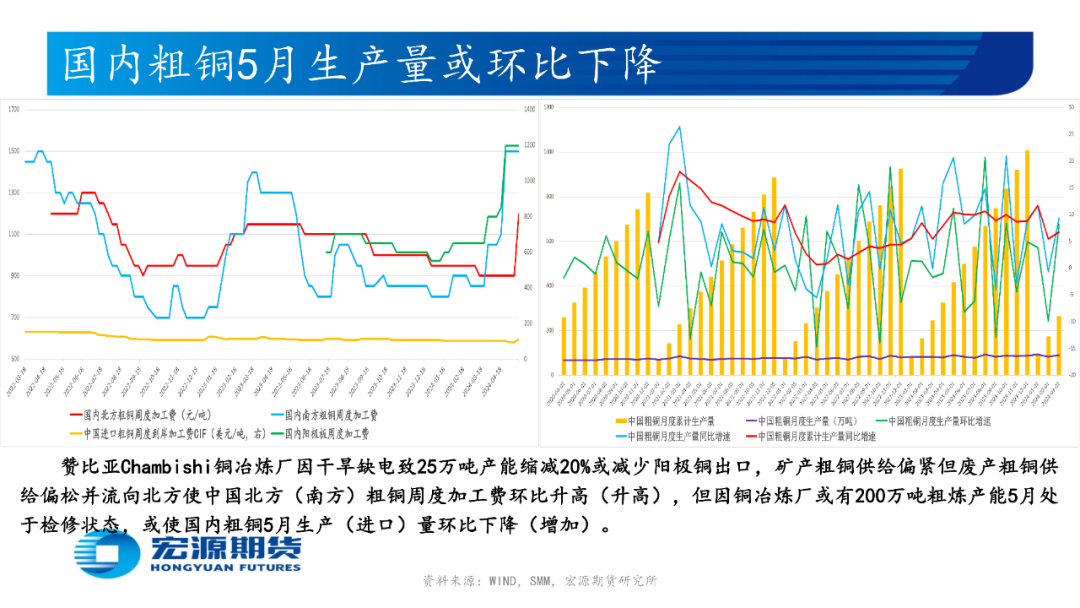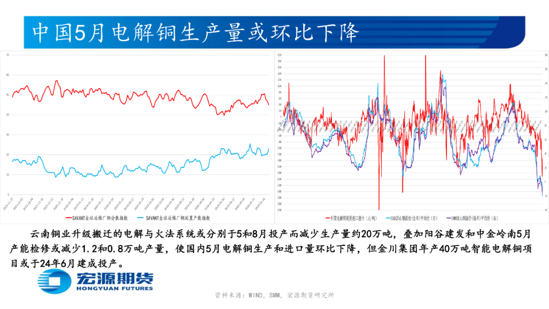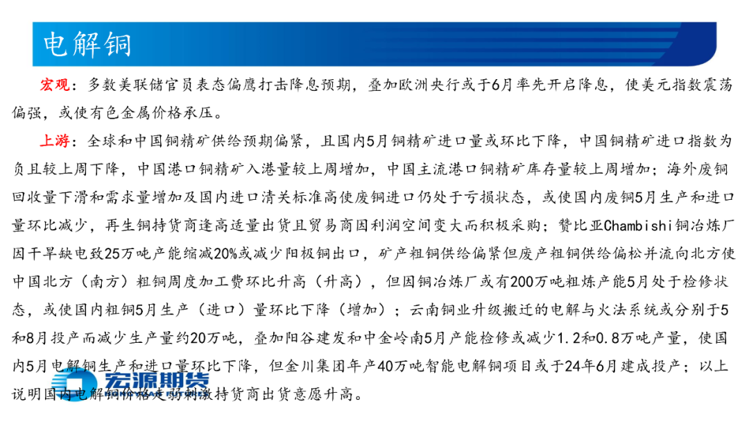 上游:全球和中国铜精矿供给预期偏紧,且国内5月铜精矿进口量或环比下降,中国铜精矿进口指数为负且较上周下降,中国港口铜精矿入港量较上周增加,中国主流港口铜精矿库存量较上周增加;海外废铜回收量下滑和需求量增加及国内进口清关标准高使废铜进口仍处于亏损状态,或使国内废铜5月生产和进口量环比减少,再生铜持货商逢高适量出货且贸易商因利润空间变大而积极采购;赞比亚Chambishi铜冶炼厂因干旱缺电致25万吨产能缩减20%或减少阳极铜出口,矿产粗铜供给偏紧但废产粗铜供给偏松并流向北方使中国北方(南方)粗铜周度加工费环比升高(升高),但因铜冶炼厂或有200万吨粗炼产能5月处于检修状态,或使国内粗铜5月生产(进口)量环比下降(增加);云南铜业升级搬迁的电解与火法系统或分别于5和8月投产而减少生产量约20万吨,叠加阳谷建发和中金岭南5月产能检修或减少1.2和0.8万吨产量,使国内5月电解铜生产和进口量环比下降,但金川集团年产40万吨智能电解铜项目或于24年6月建成投产;以上说明国内电解铜价格走弱刺激持货商出货意愿升高。