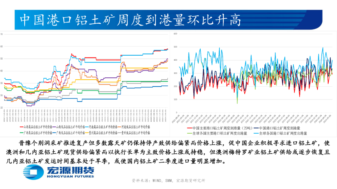 晋豫个别洞采矿推进复产但多数露天矿仍保持停产致供给偏紧而价格上涨,促中国企业积极寻求进口铝土矿,使澳洲和几内亚铝土矿现货供给偏紧而以执行长单为主致价格上涨或持稳,但澳洲梅特罗矿业铝土矿供给或逐步恢复且几内亚铝土矿发运时间基本处于旱季,或使国内铝土矿二季度进口量增加;