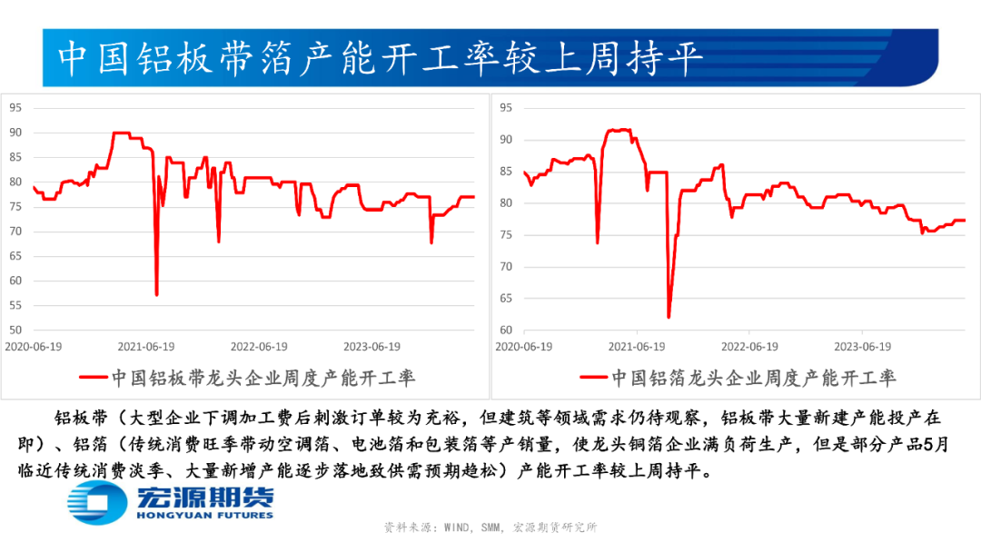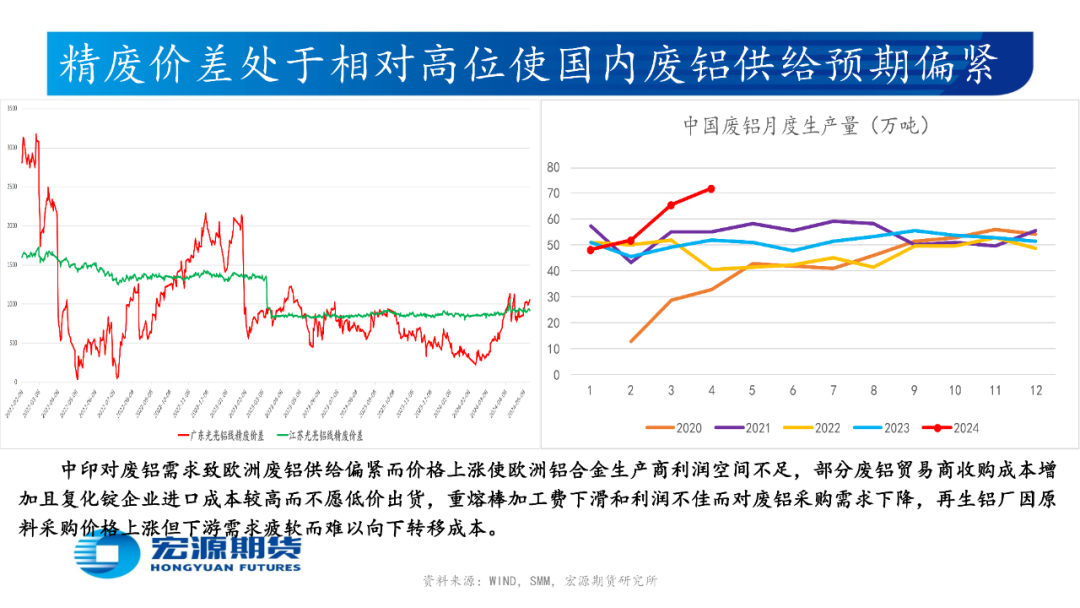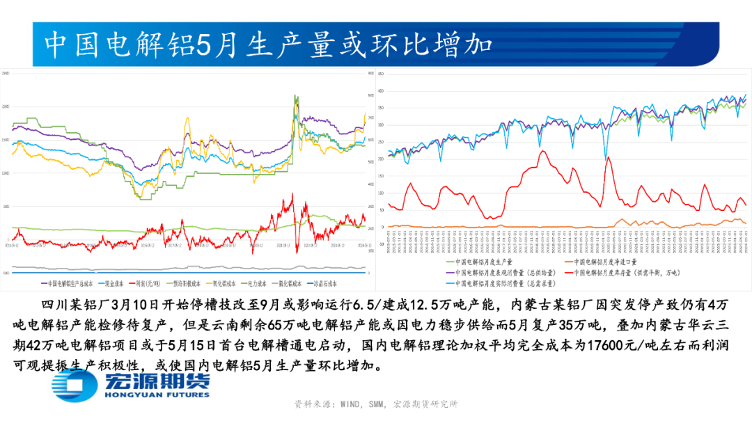 四川某铝厂3月10日开始停槽技改至9月或影响运行6.5/建成12.5万吨产能,内蒙古某铝厂因突发停产致仍有4万吨电解铝产能检修待复产,但是云南剩余65万吨电解铝产能或因电力稳步供给而5月复产35万吨,叠加内蒙古华云三期42万吨电解铝项目或于5月15日首台电解槽通电启动,国内电解铝理论加权平均完全成本为17600元/吨左右而利润可观提振生产积极性,或使国内电解铝5月生产量环比增加;