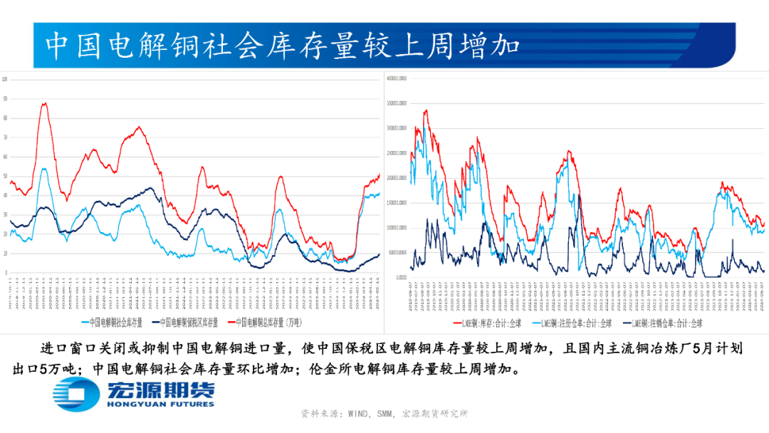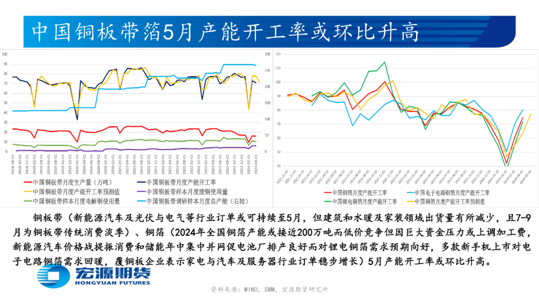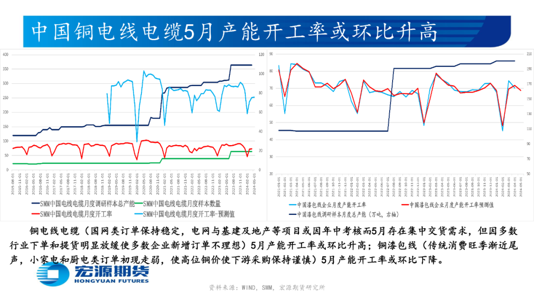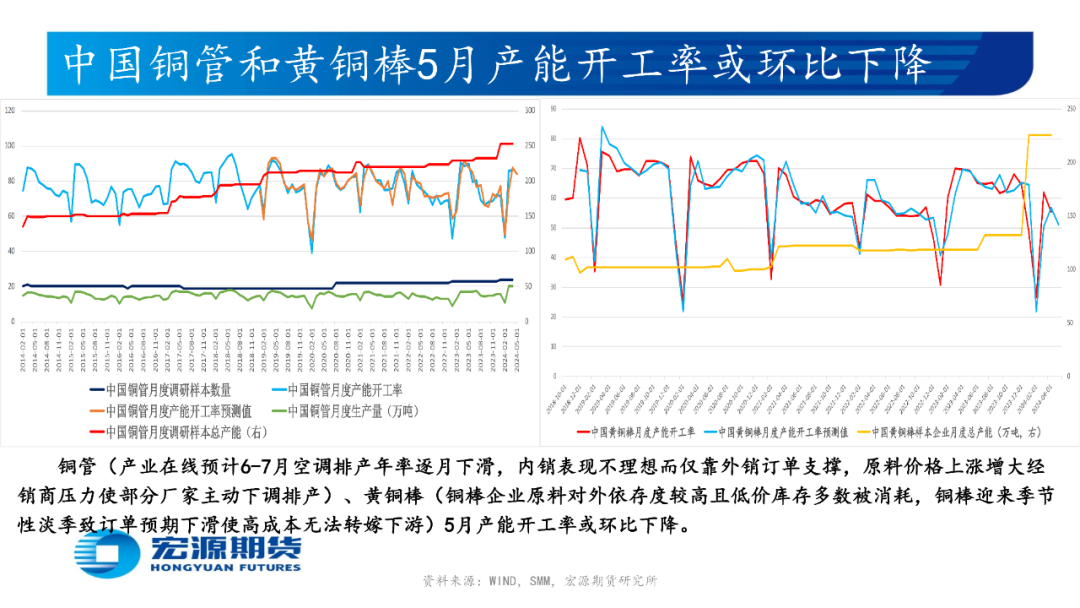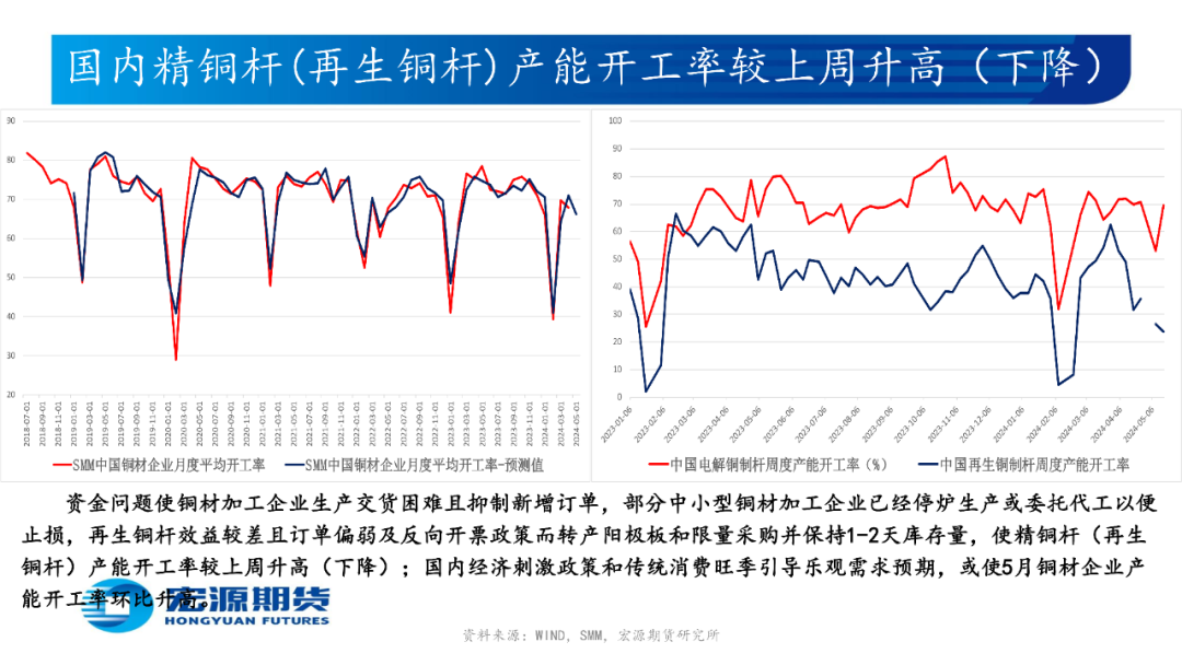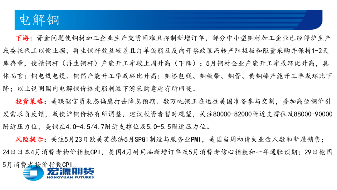 资金问题使铜材加工企业生产交货困难且抑制新增订单,部分中小型铜材加工企业已经停炉生产或委托代工以便止损,再生铜杆效益较差且订单偏弱及反向开票政策而转产阳极板和限量采购并保持1-2天库存量,使精铜杆(再生铜杆)产能开工率较上周升高(下降);5月铜材企业产能开工率或环比升高,具体而言:铜电线电缆、铜箔产能开工率或环比升高;铜漆包线、铜板带、铜管、黄铜棒产能开工率或环比下降;以上说明国内电解铜价格走弱刺激下游采购意愿有所回暖。