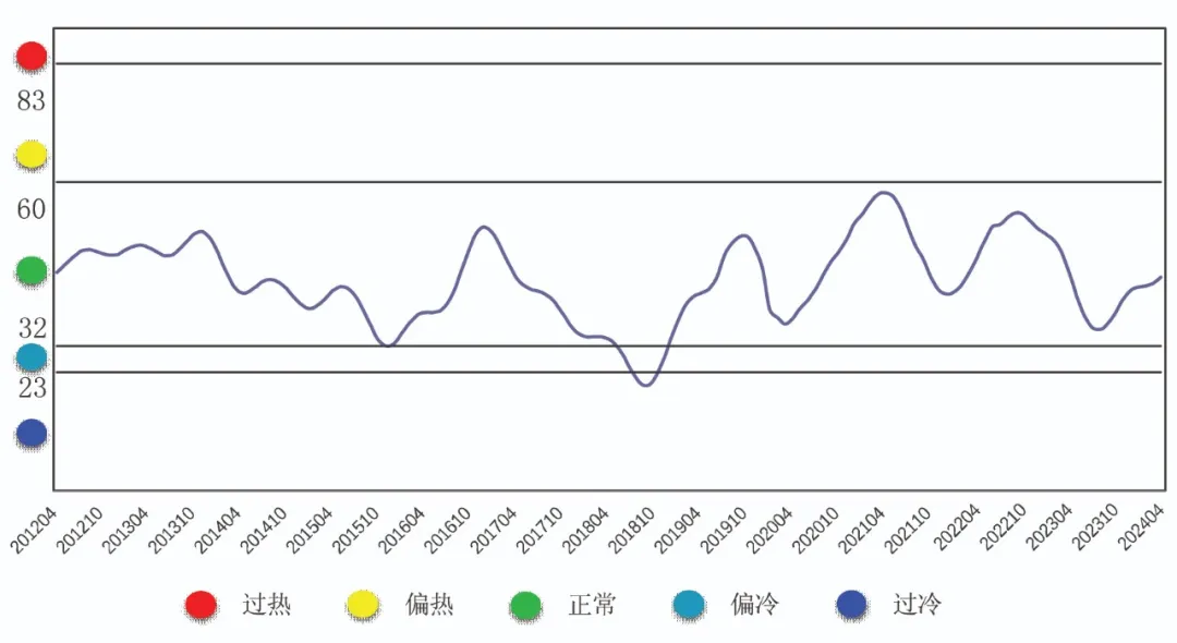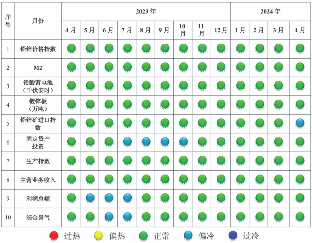 4. 综合景气指数反映当前铅锌产行发展景气程度。景气灯号图把铅锌产业经济运行状态分为5个级别:“红灯”表示经济过热,“黄灯”表示经济偏热,“绿灯”表示经济运行正常,“浅蓝灯”表示经济偏冷,“蓝灯”表示经济过冷。对单项指标灯号赋予不同的权重,将其汇总而成的综合景气指数也同样由5个灯区显示。