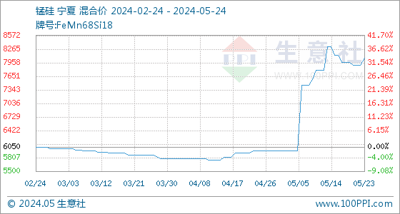 5月24日,生意社锰硅基准价为8058.33元/吨,与本月初(5955.00元/吨)相比,上涨了35.32%。