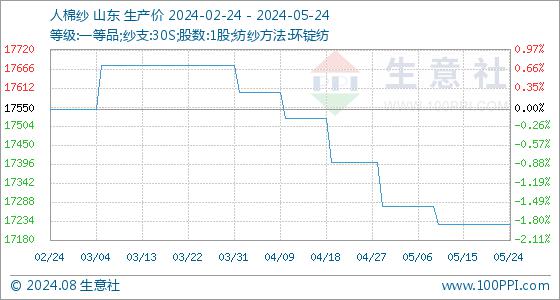 5月24日,生意社人棉纱基准价为17225.00元/吨,与本月初(17275.00元/吨)相比,下降了-0.29%。