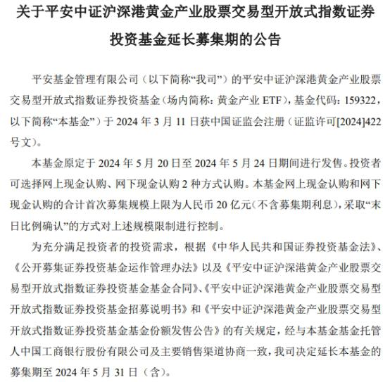 中国经济网北京5月24日讯今日,平安基金管理有限公司发布关于平安中证沪深港黄金产业股票交易型开放式指数证券投资基金延长募集期的公告。公告显示,平安中证沪深港黄金产业股票交易型开放式指数证券投资基金(简称:平安中证沪深港黄金产业ETF,基金代码:159322)原定于2024年5月20日至2024年5月24日期间进行发售,现决定延长该基金的募集期至2024年5月31日(含)。
