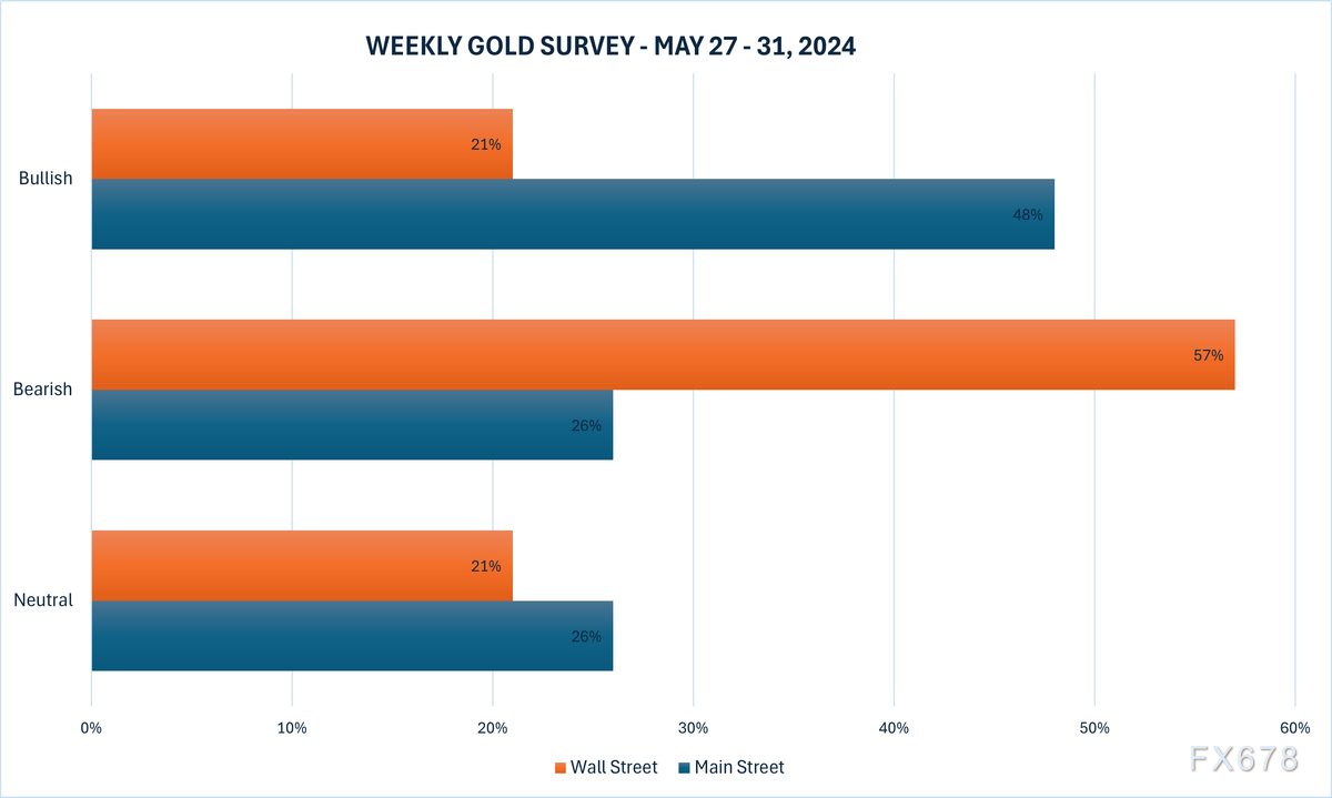 华尔街的14位分析师中,有21%预计金价将上涨,57%预测金价将下跌,而21%认为金价将横盘整理。与此同时,在线调查中的195名散户投资者则显示出更多的看涨情绪,其中48%预计金价将上涨,26%预测金价将走低,21%预计金价将维持区间波动。
