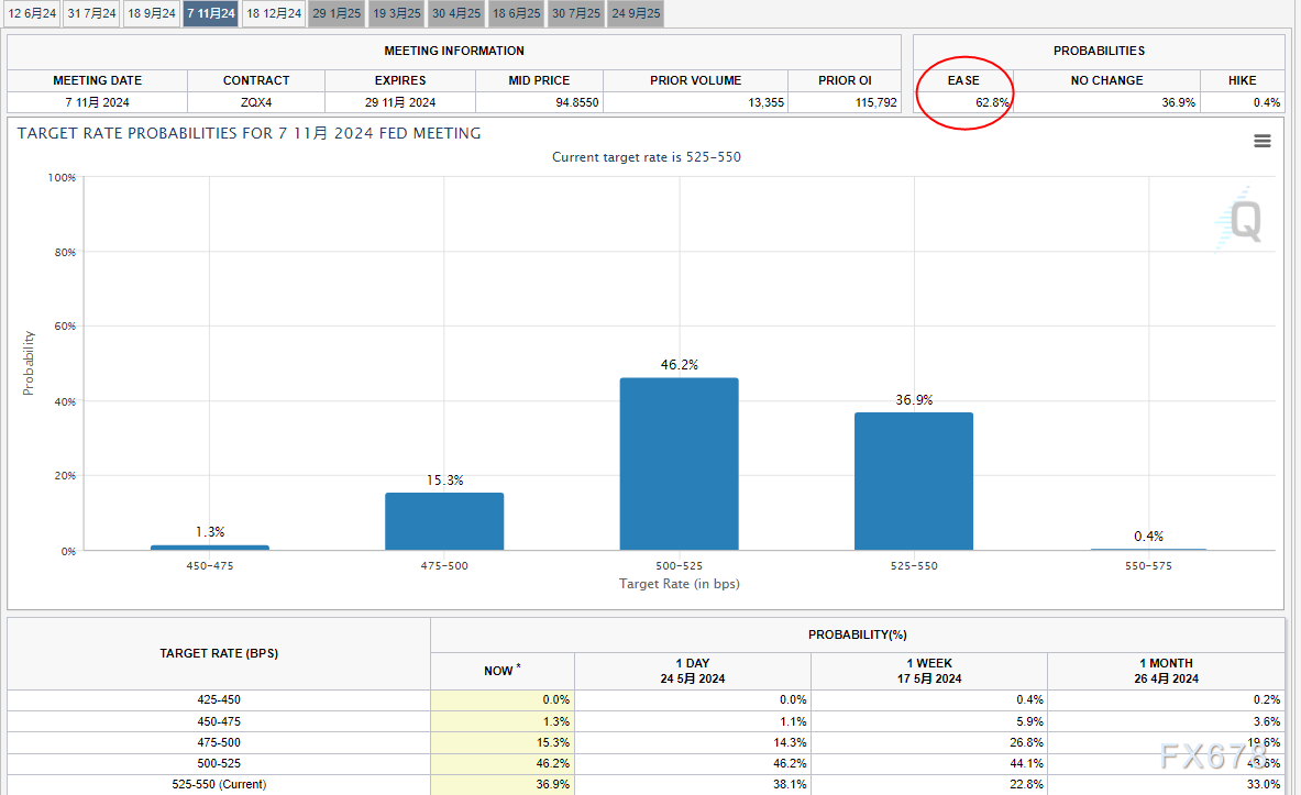 交易商的押注暗示,他们越来越怀疑美联储会在2024年降息超过一次,根据芝商所的FedWatch工具,市场目前预计美联储11月降息的概率约为63%。