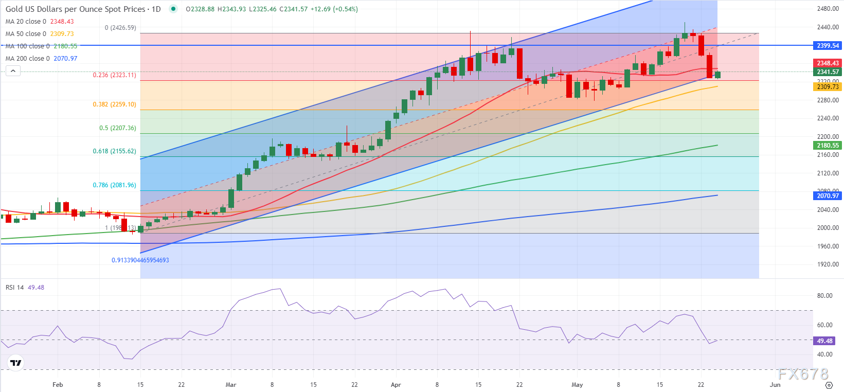 金价上周一(5月20日)触及2449.89美元的纪录高位,但此后下跌超过100美元,周线下跌3.3%,创12月初以来最大单周跌幅。