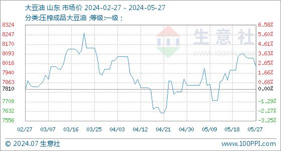 5月27日,生意社大豆油基准价为8060.00元/吨,与本月初(7840.00元/吨)相比,上涨了2.81%。