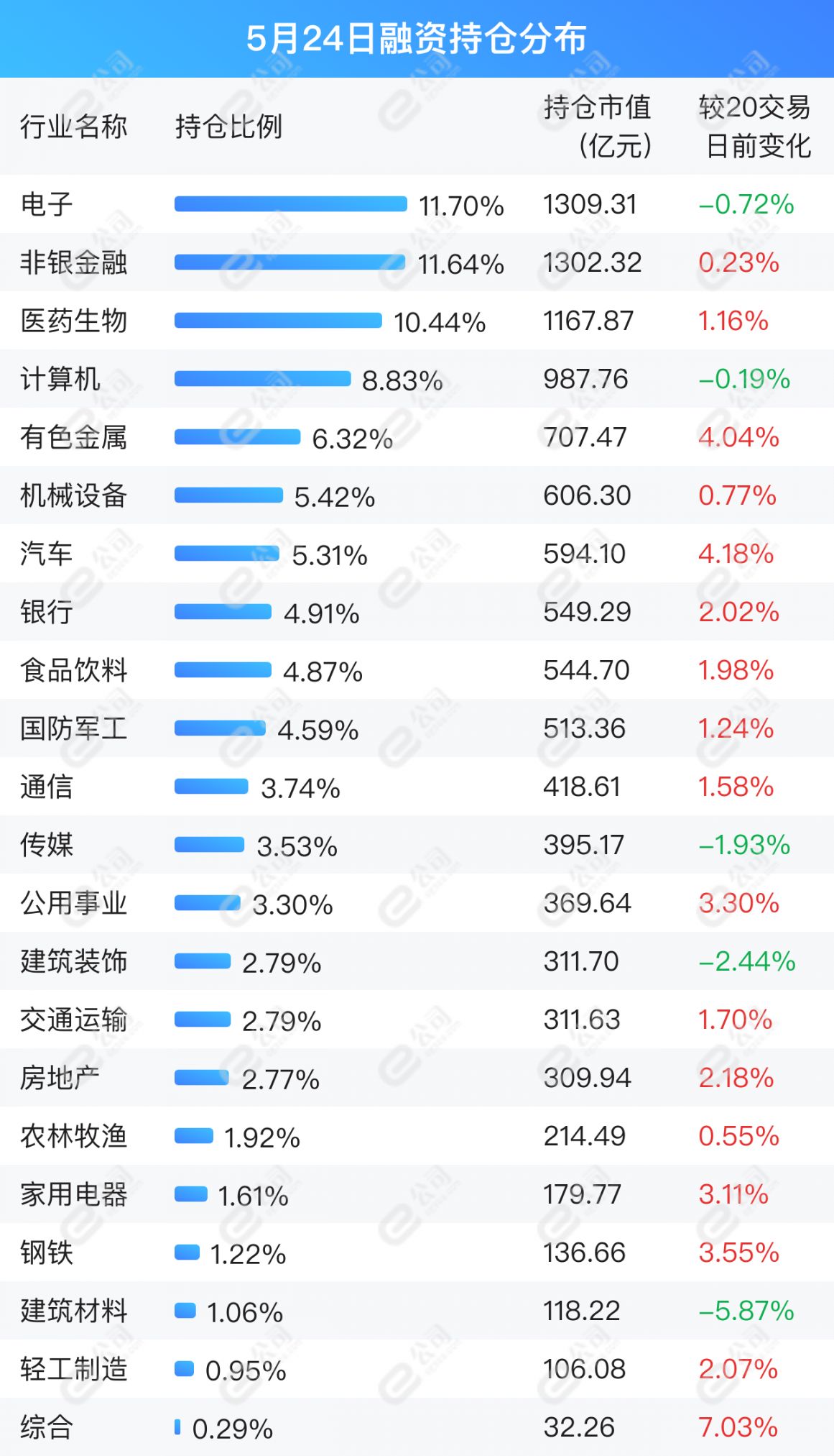 e公司数据统计显示,截至5月24日,融资持仓市值前五行业为电子、非银金融、医药生物、计算机、有色金属,占持仓总市值48.94%。