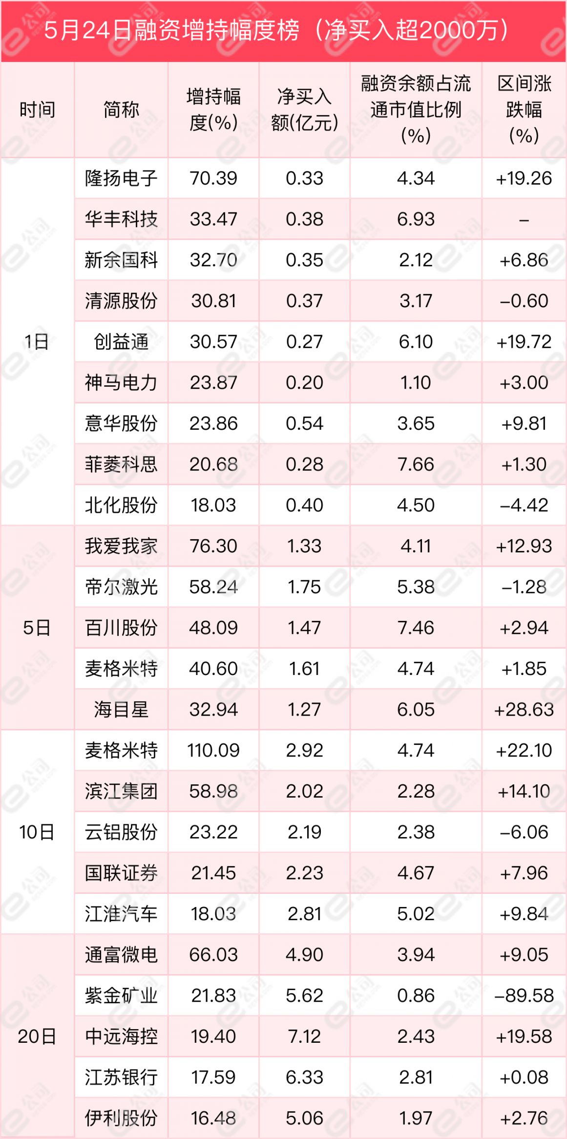 从增减持幅度来看,单日净买卖超2000万元以上的个股中,隆扬电子、华丰科技、新余国科获融资增持幅度居前,分别为70.39%、33.47%、32.7%。