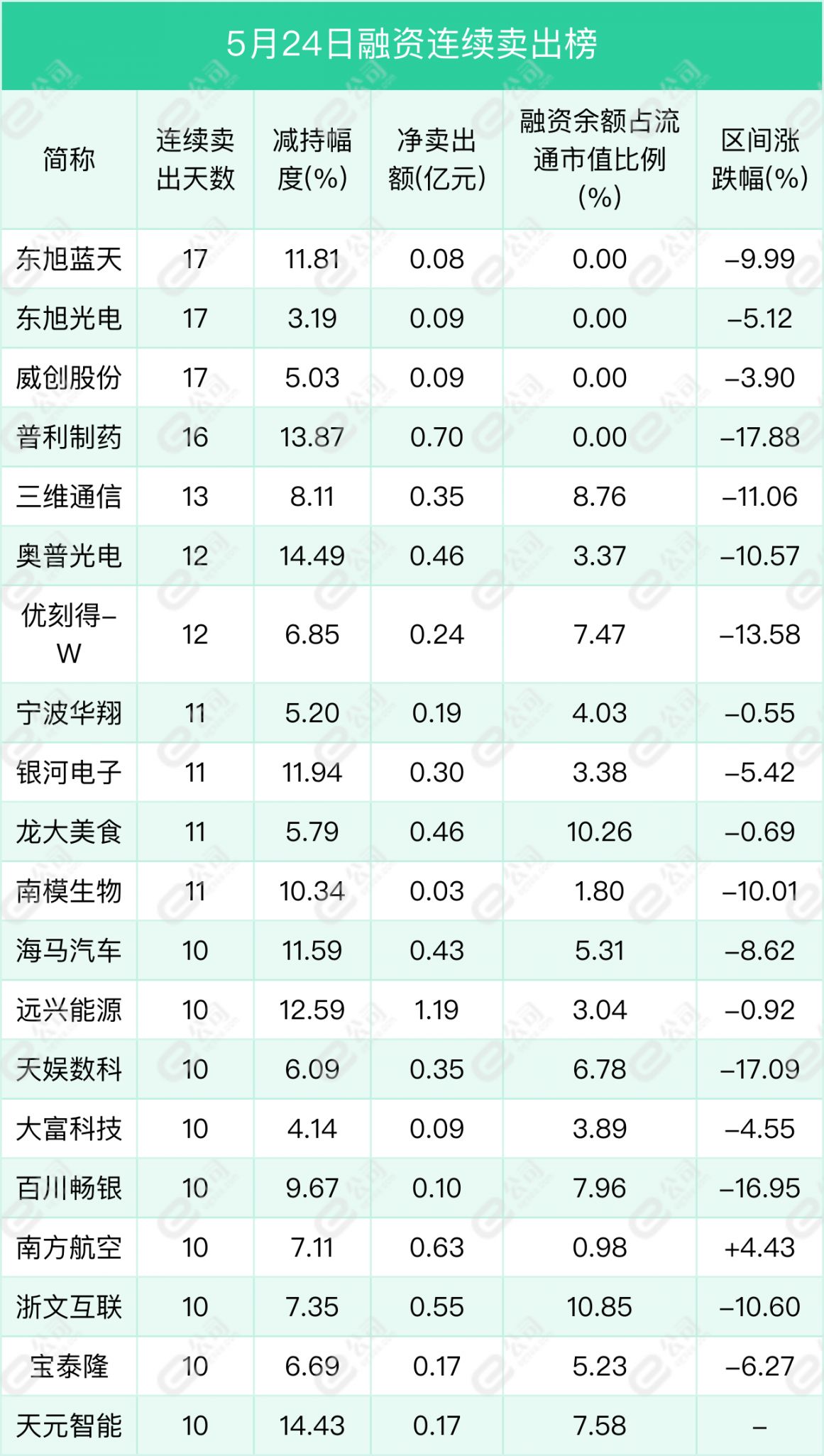 东旭蓝天、东旭光电、威创股份遭融资连续净卖出天数居前,分别为17天、17天、17天,期间净卖出额分别为0.08亿元、0.09亿元、0.09亿元,期间减持幅度分别为11.81%、3.19%、5.03%。