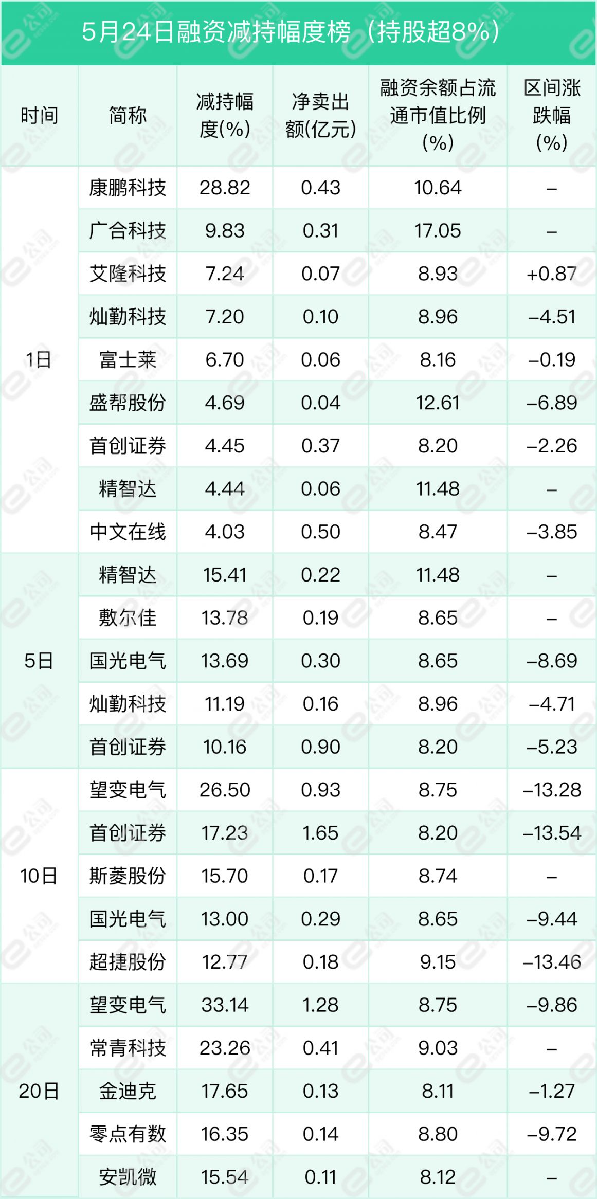 康鹏科技、广合科技、艾隆科技遭融资减持幅度居前,分别为28.82%、9.83%、7.24%。