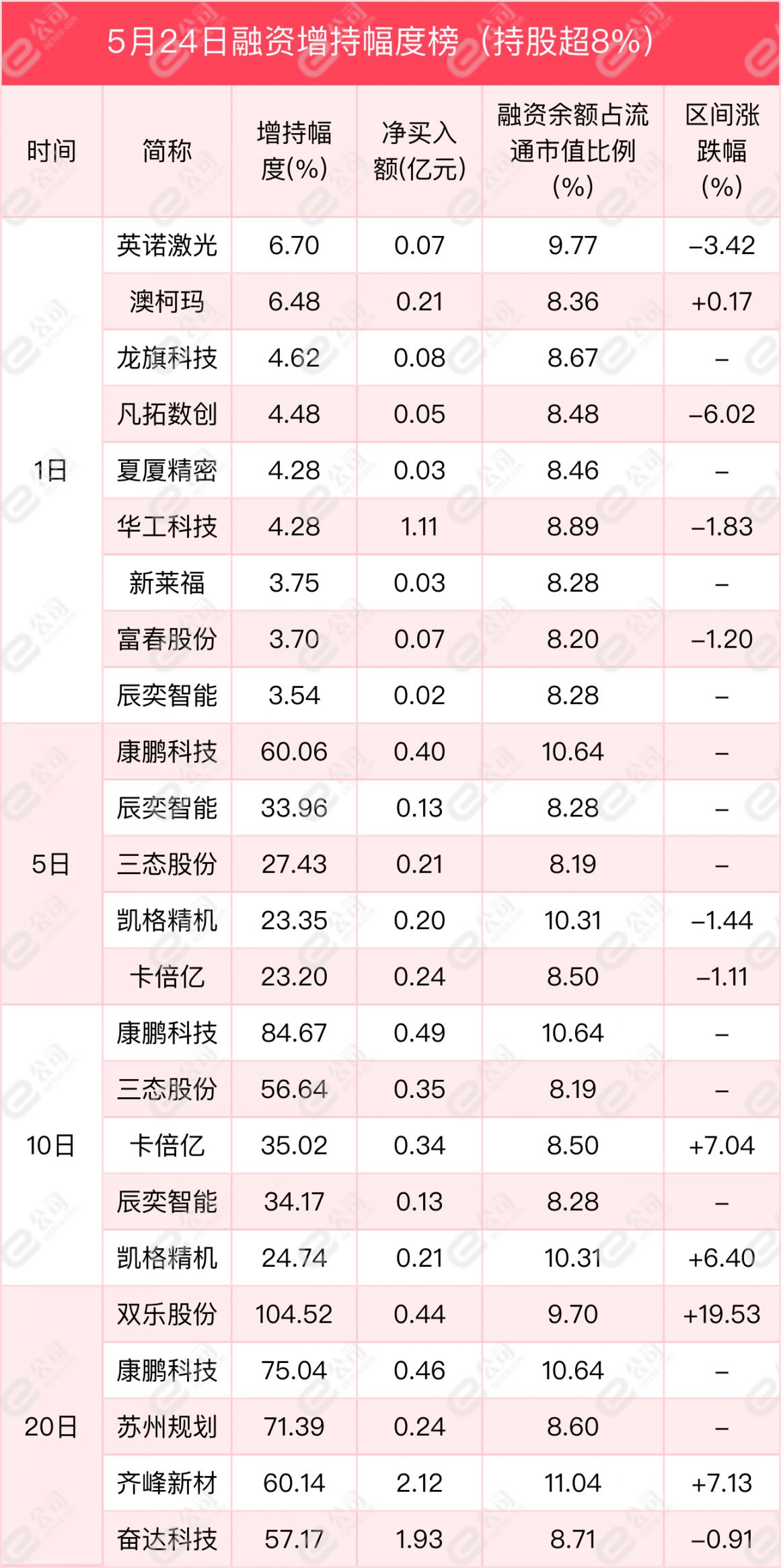 从增减持幅度来看,融资余额占流通股比例超8%的个股中,英诺激光、澳柯玛、龙旗科技获融资增持幅度居前,分别为6.7%、6.48%、4.62%。
