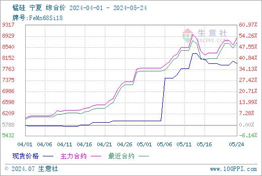 本周硅锰市场强势运行,成本端冶金焦第一轮降价落地,化工焦价格本周也经历第二轮下调,锰矿市场价格保持高位,主流价格本周有1-2元/吨度的上行,整体来看合金成本支撑仍然较强,带动合金现货价格快速上涨。根据生意社商品行情分析系统的数据显示,5月24日硅锰在宁夏地区(规格为FeMN68Si18)的市场报价在7900-8050元/吨左右,市场均价7958元/吨,较上周涨0.63%。