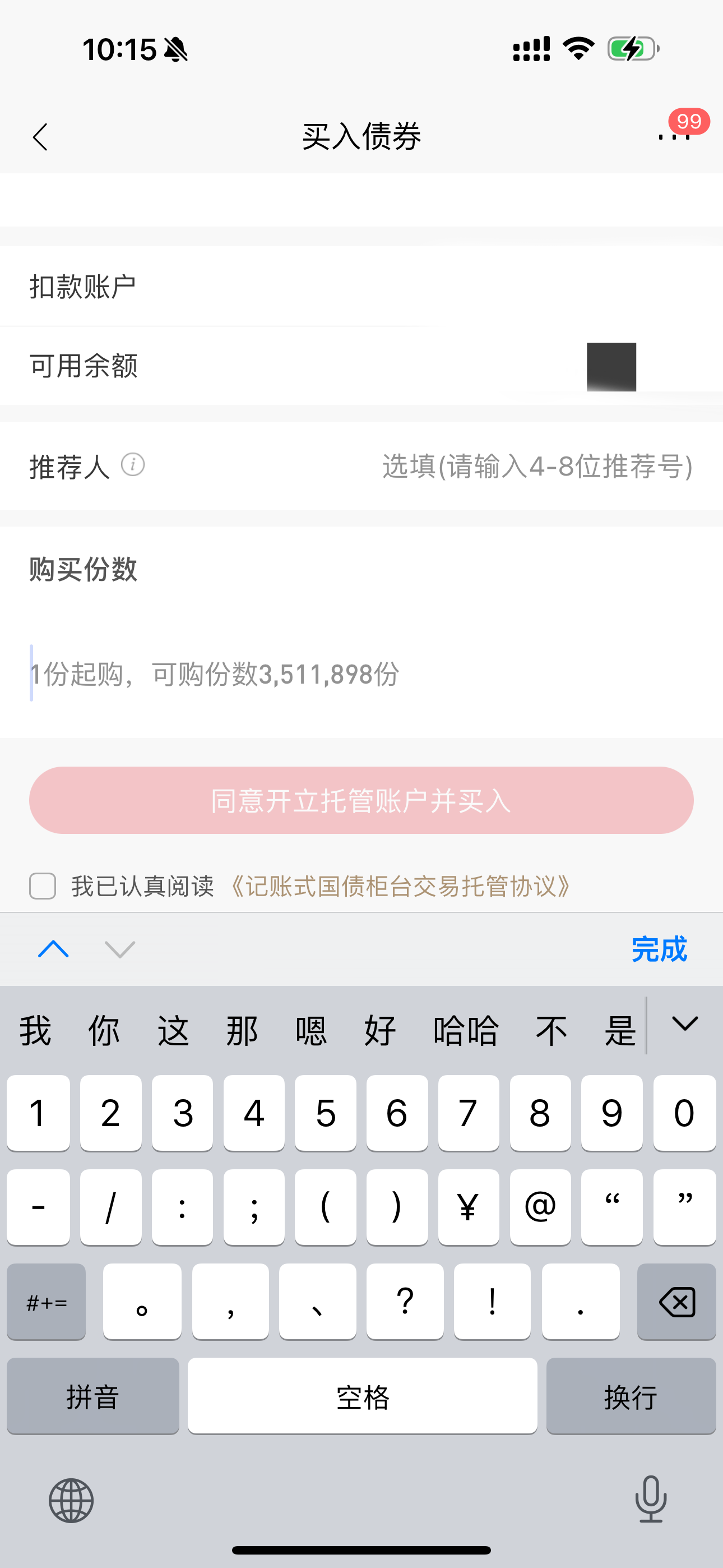 10点15分,招商银行APP显示“24特别国债02”剩余351万份额度