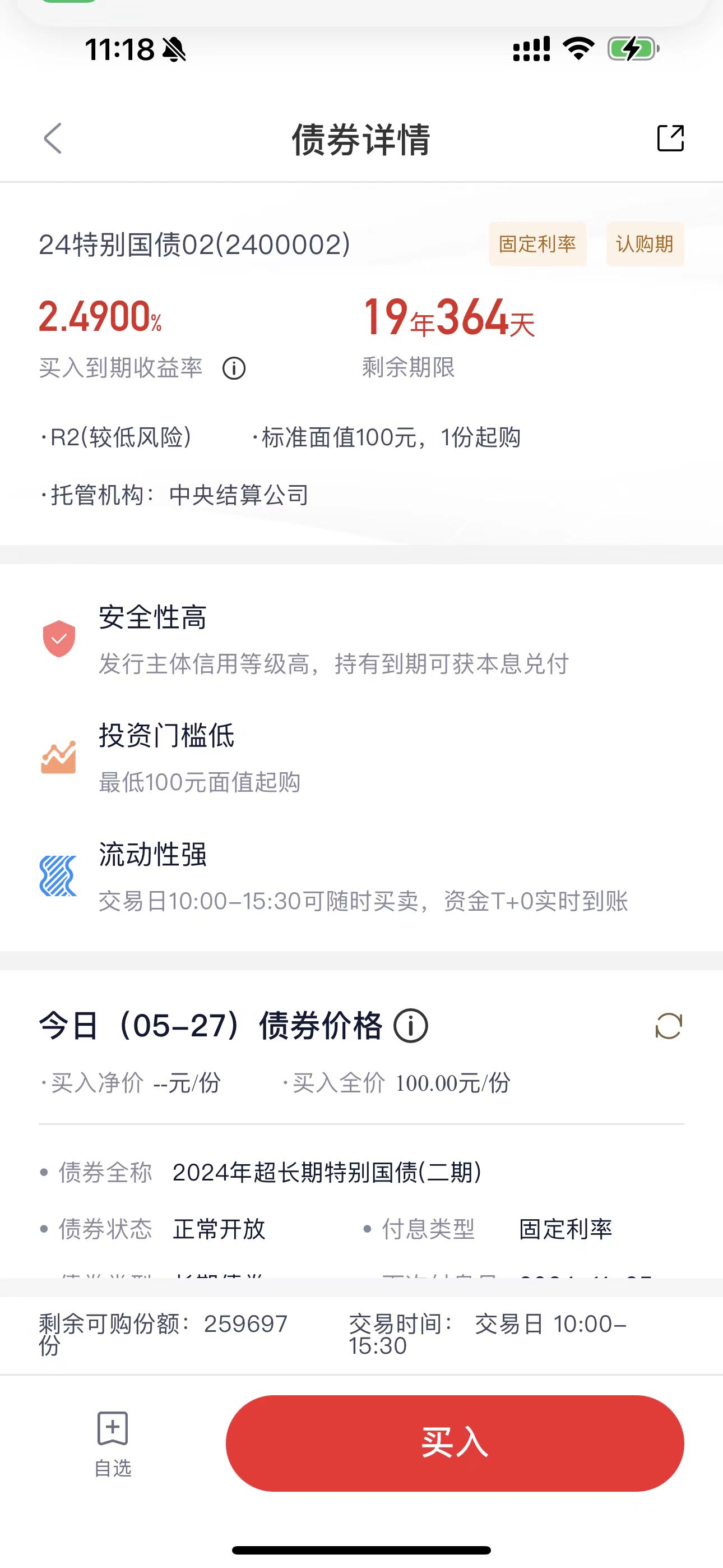 目前“24特别国债01”在招商银行显示的买入净价为100.31元,较票面价格涨幅约0.31%,到期年化收益率为2.56%。