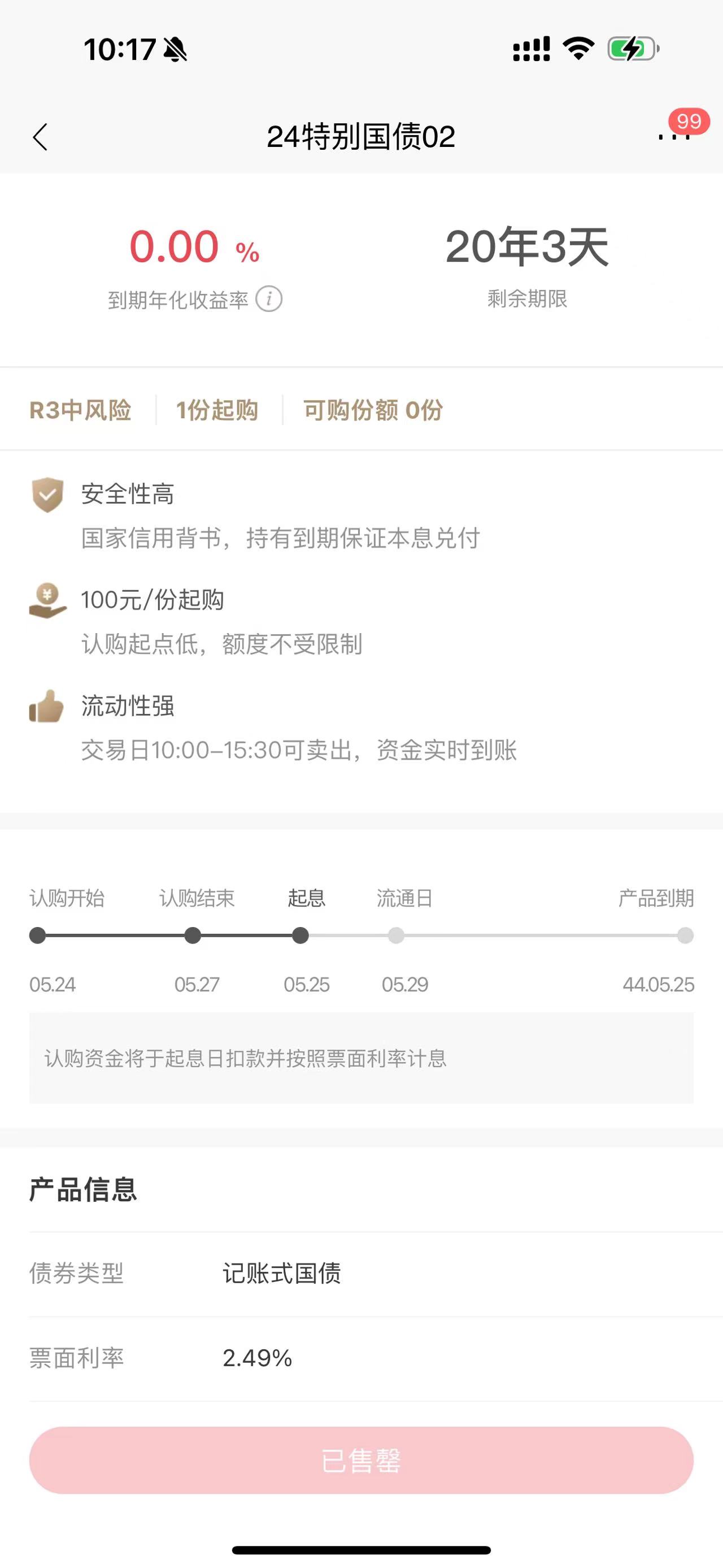 10点17分,招商银行APP显示“24特别国债02”已售罄