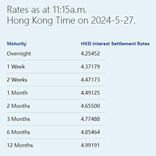 5月27日,港元拆息几乎全线上升,其中,隔夜拆息连升两天,涨21基点至4.25452%,创逾三周新高。与楼按相关的一个月拆息亦两连升,报4.49125%,为4月3日以来最高。