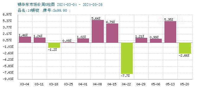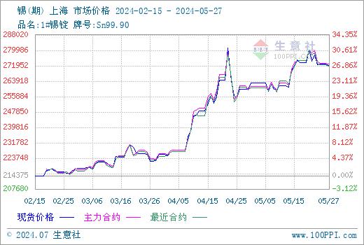 据生意社商品行情分析系统监测:本周(5.20-5.27)华东地区1#锡锭市场震荡下行,上周初市场均价在280310元/吨,本周初市场均价在272260元/吨,周跌2.87%。