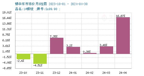商品价格K柱图,运用价格走势K线的理念,以柱状图形式,反映每周或者每月的价格涨跌变化,投资者可以根据K柱图的变化,来进行买卖投资。红色表示:上涨;绿色表示:下跌;K柱高度表示:涨跌幅度。从月度K柱图可以看出2022年11月后受宏观因素影响,锡价连续上涨3个月,自2023年2月价格单月下跌11.35%,近三个月锡价走势窄幅波动。从周度度K柱图可以看出锡锭市场近期涨多跌少。