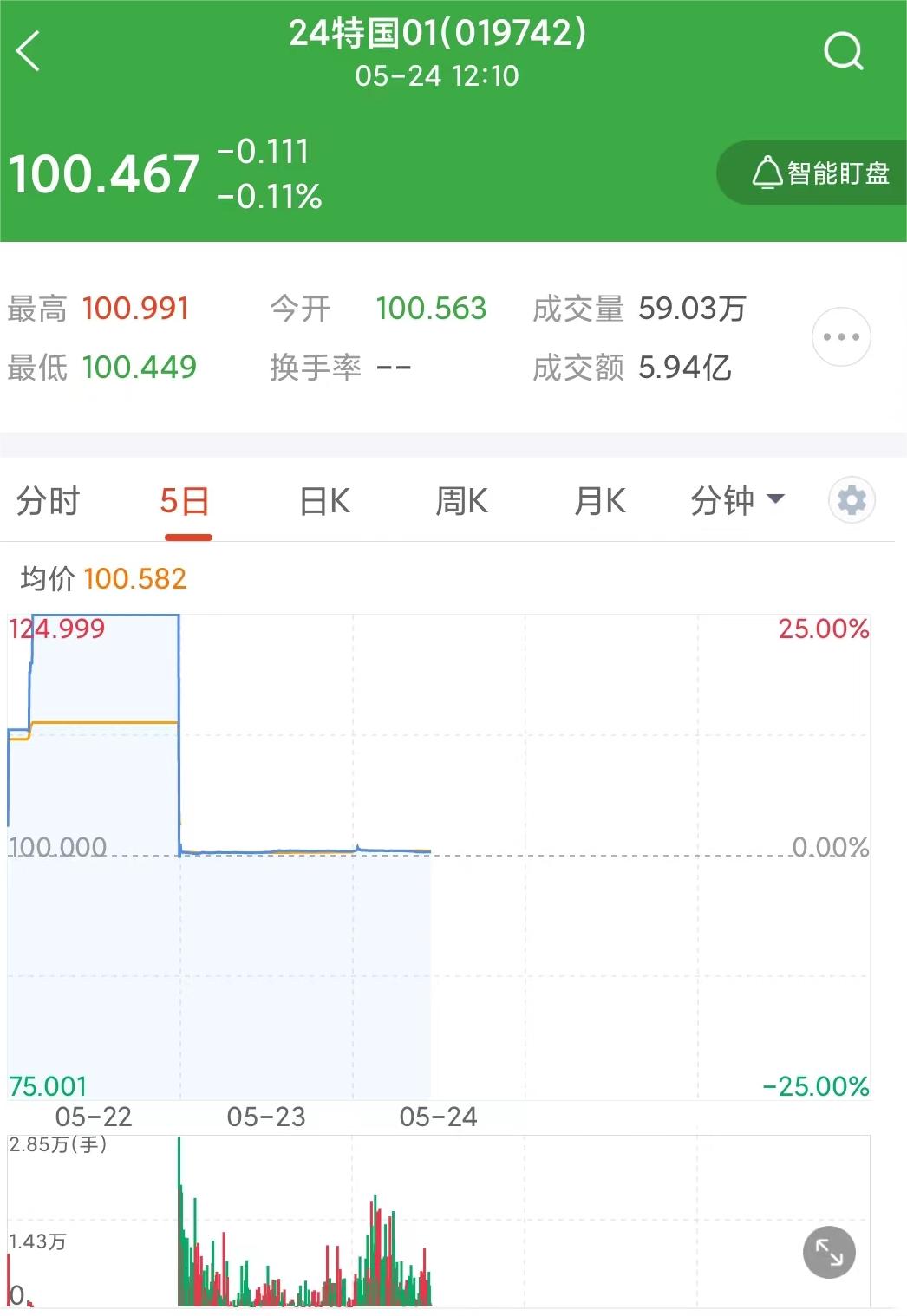 记者注意到,5月24日11时,上述两款国债产品019742和102267的最新交易价格已分别降至100.45和100.54元。
