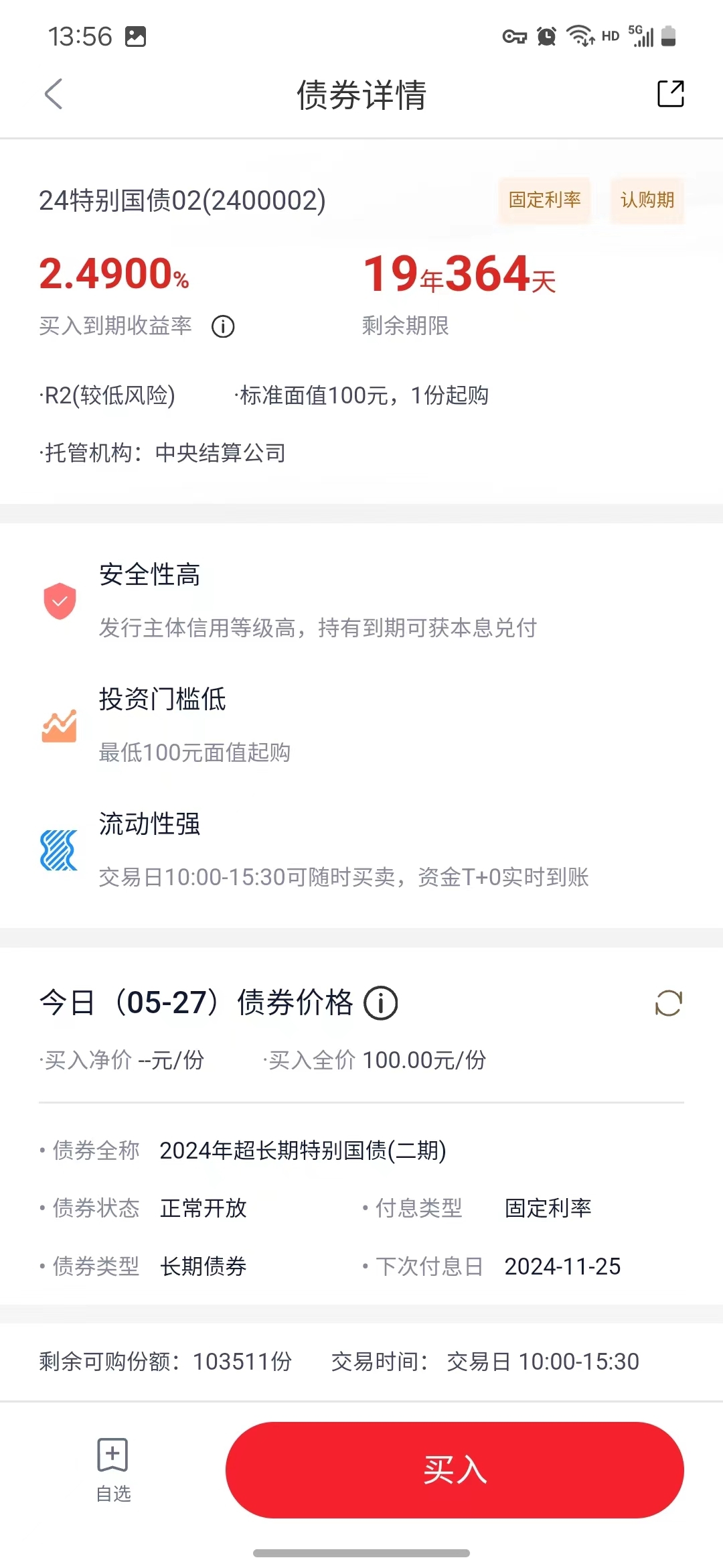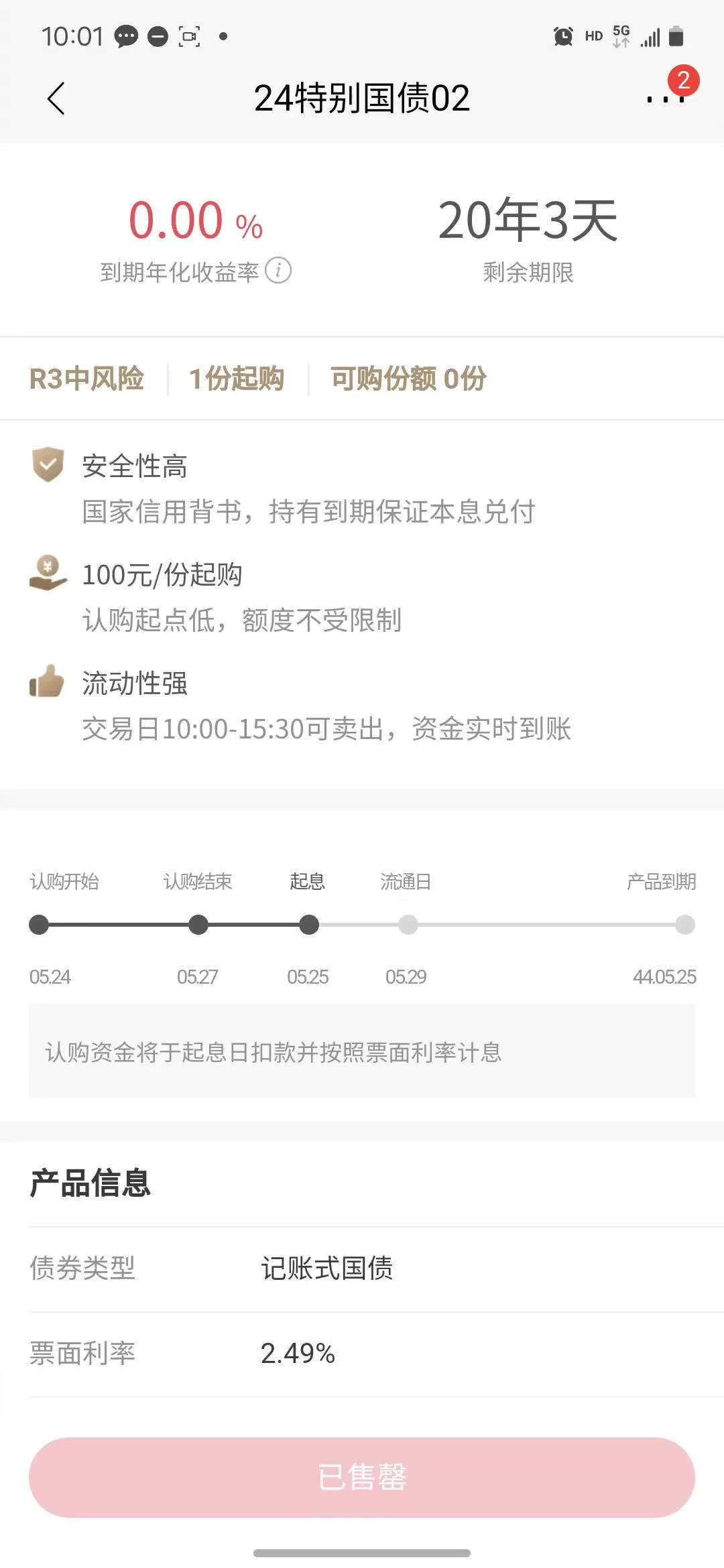 招商银行“24特别国债02”的产品信息显示,该债券的类型为记账式国债,风险等级为R3中风险,票面利率为2.49%,期限为20年,付息方式为定期支付,付息周期6个月,起息日为2024年5月25日,到期日为2044年5月25日。本期超长期特别国债可于交易日10:00~15:30卖出,资金实时到账。