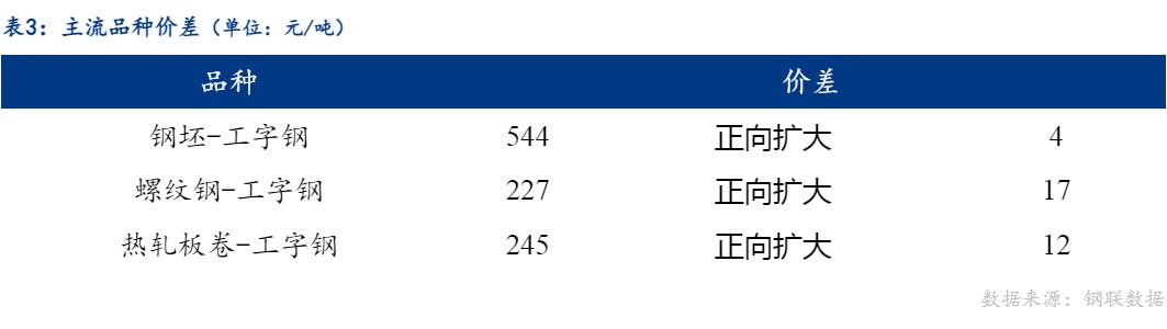 从品种价差来看,工字钢与钢坯、螺纹钢、热卷价差正向扩大。