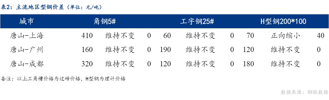 从区域价差来看,唐山与上海角钢、工字钢价差维持不变,与H型钢价差正向缩小;唐山与广州、成都角钢、工字钢、H型钢价差维持不变。