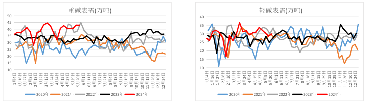 本周纯碱表需72.74万吨,环比增加1.20万吨,轻碱表需29.83万吨,需求环比增加1.26万吨,重碱表需42.97万吨,环比减少0.05万吨,需求环比增量主要来自于轻碱表需。