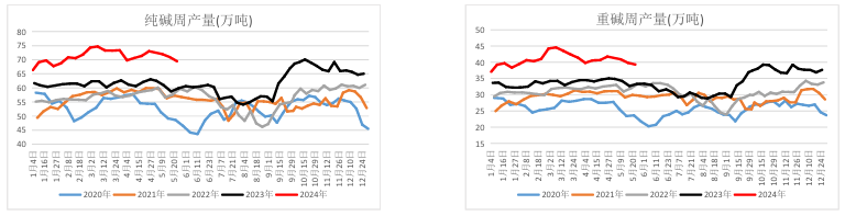 1.供应:装置开工率83.35%(-1.77%),氨碱法79.79%(环比-6.26%),联碱法89.69%(+0.99%);周产量69.48万吨(-1.48万吨),轻碱产量30.18万吨(-0.94万吨),重碱产量39.31万吨(-0.54万吨)。