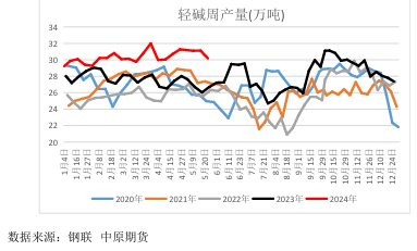 纯碱产量69.48万吨,环比减少1.48万吨,减幅1.47%。轻质碱产量为30.18万吨,环比-0.94万吨。重质碱产量为39.31万吨,环比-0.54万吨。随着前期检修装置逐步复产,预计供应将有所恢复。