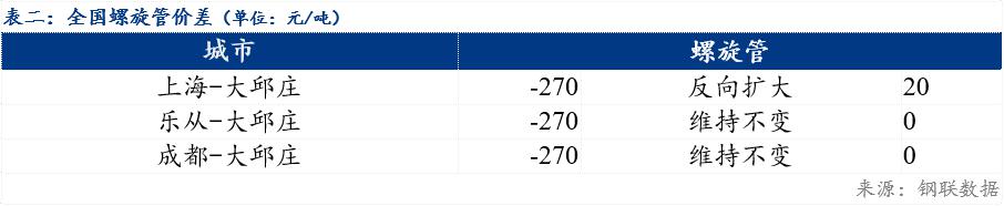 今日螺旋管南北价差较上一交易日小幅波动,华东区域与华北区域价差为-270元/吨,华南与华北价差为-270元/吨,西南与华北价差为-270元/吨。