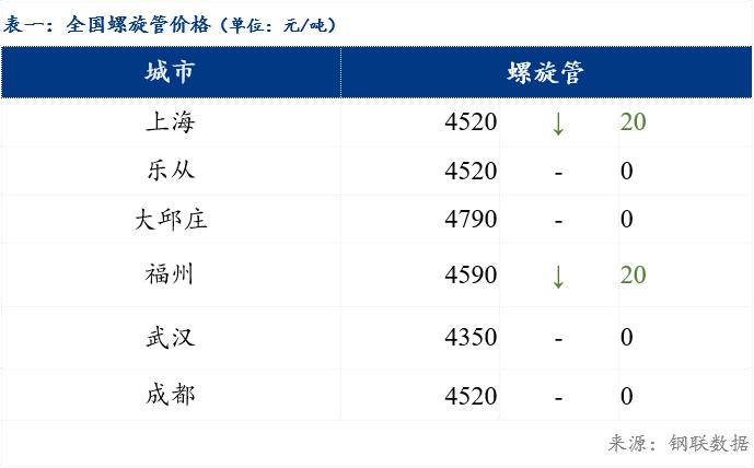 今日主流城市螺旋管价格下跌。截至发稿,219*6mm上海地区报4520元/吨,较上一交易日下跌20元/吨;乐从地区报4520元/吨,较上一交易日持平;大邱庄地区报4790元/吨,较上一交易日持平。