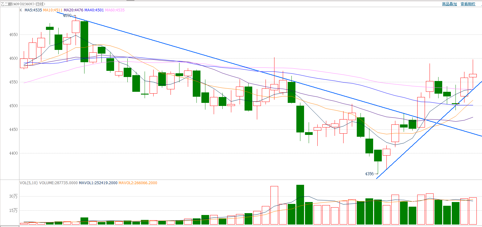 截至前一个交易日收盘,乙二醇窄幅波动,收小阳线。日k线延续反弹走势,并站稳60日均线。