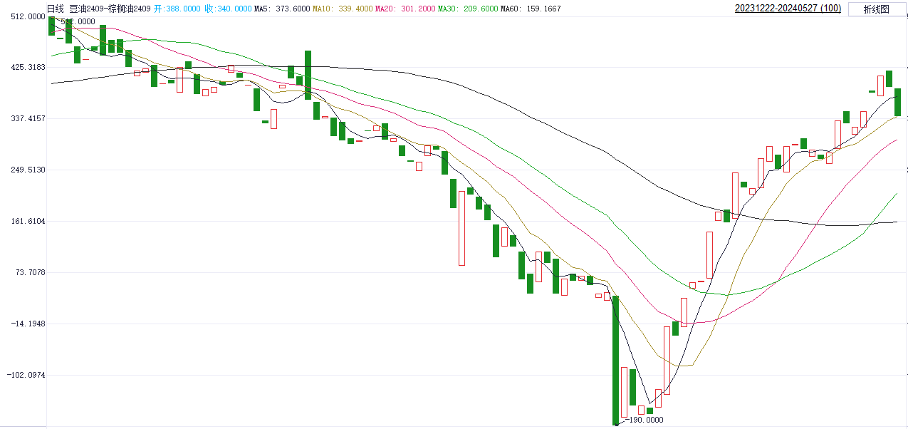 操作策略:多豆油空棕榈09,为跨品种套利策略,可适当关注。 若差价下破300取消关注。