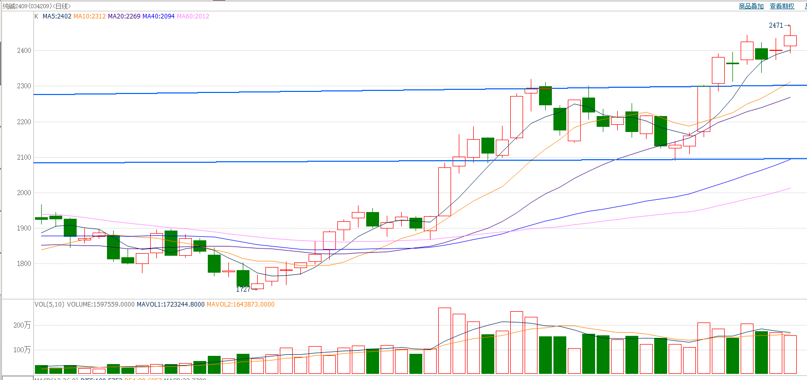 截至前一个交易日收盘,纯碱高开高走,收小阳线。日k线突破上行,2300附近压力变支撑。