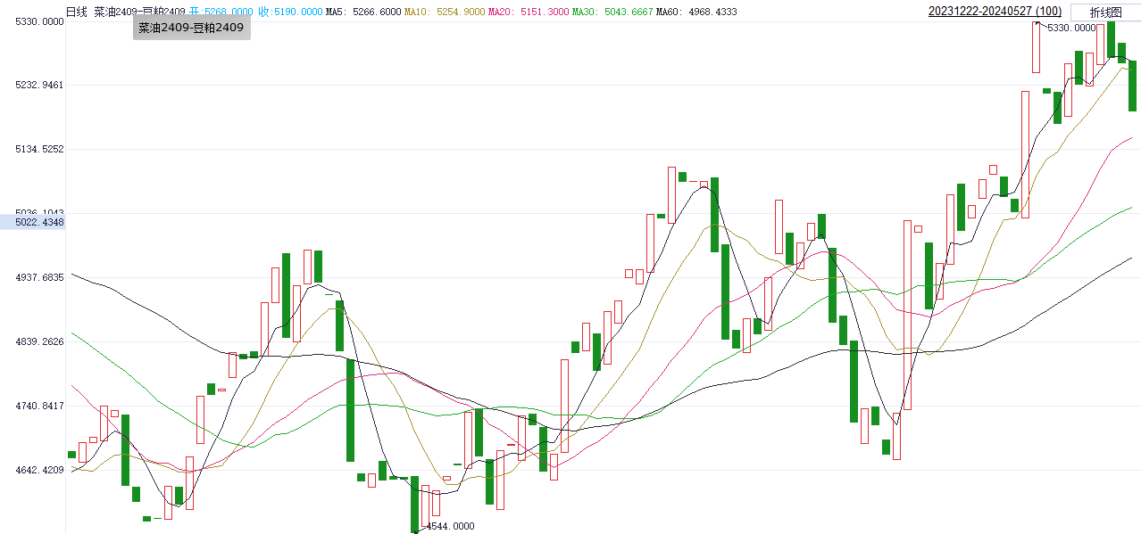 菜油短期供应偏紧,下游需求改善,现货价格坚挺;菜粕期价前期涨幅较大,目前面临一定调整压力。预计菜粕短期行情或保持高位震荡的可能。相较菜油而言,近期菜粕走势面临阻力略偏大。