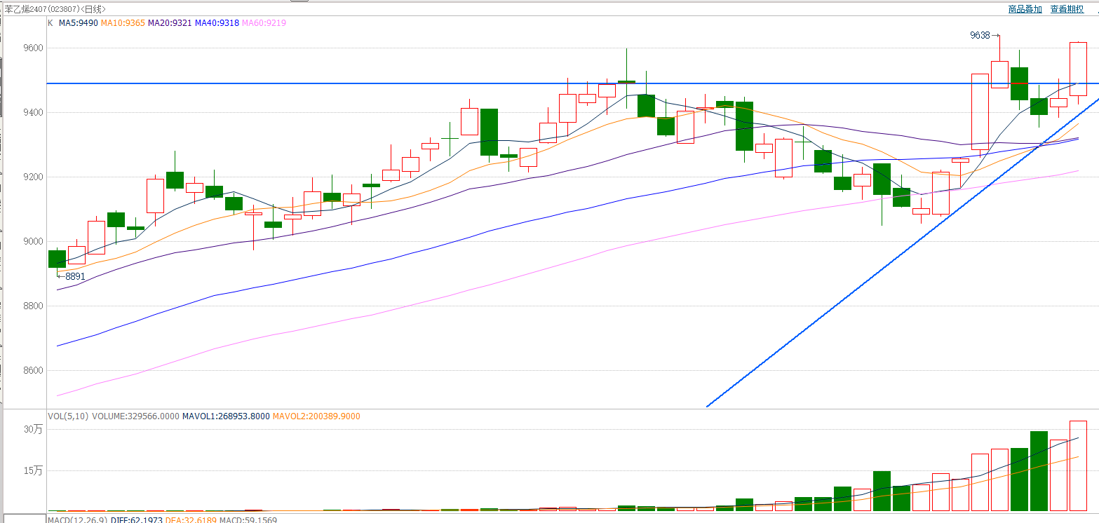 截至前一个交易日收盘,苯乙烯震荡上行,收长阳线。日k线收盘价创近期新高,打开上行空间。