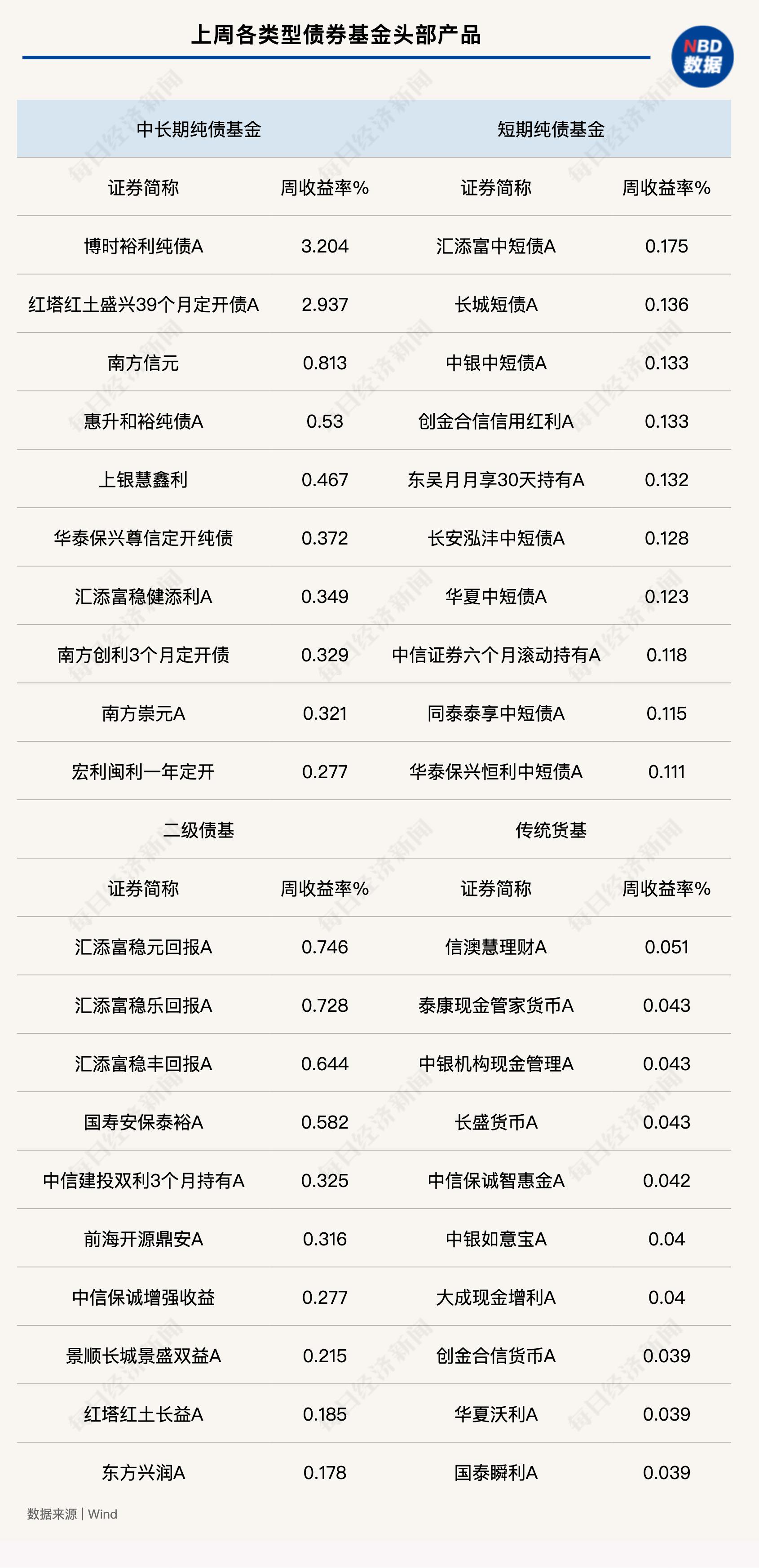 而就全周的统计来看,统计显示,中长期纯债基金的收益率明显好过短债产品。从头部业绩来看,博时裕利纯债A录得3.2040%,在所有纯债基金当中最高。从产品业绩中位数来看,中长期纯债基金的业绩中位数在0.0772%,短债基金则为0.0537%。