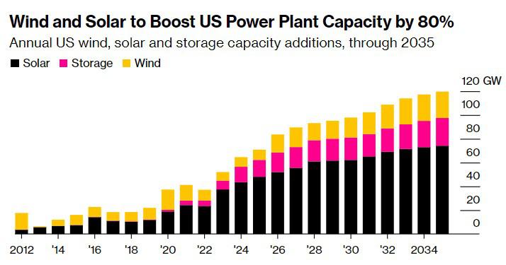 美国电网有望从可再生能源中获得巨大提振。据BloombergNEF预测,到2035年,美国的总发电量将跃升80%,这主要得益于近1太瓦的新增太阳能和风能。预计新增的737吉瓦太阳能是去年年底总装机容量的四倍多,而新增的200吉瓦风能将是美国涡轮机装机容量的两倍多。这一预测出炉之际,公用事业公司正竞相从电网中减少碳排放,同时增加新产能,以满足工厂、人工智能和电动汽车日益增长的能源需求。