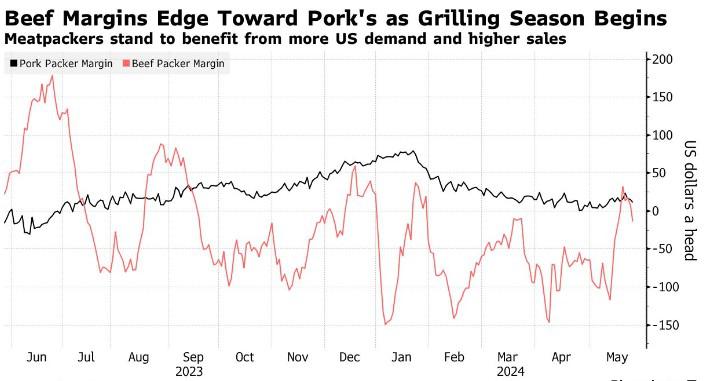 美国的阵亡将士纪念日标志着美国户外烧烤季节的非正式开始,这带来了对肉类的年度需求增长。上周,牛肉包装业的利润率自去年9月以来首次超过猪肉包装业。这是因为美国的生猪数量相对充足,而加工商不得不为紧张的牛供应买单。鉴于美国人通常更喜欢烤牛排和汉堡,而不是猪排,在这个烧烤季节,牛肉的利润波动更大,可能会对猪肉的利润构成挑战。