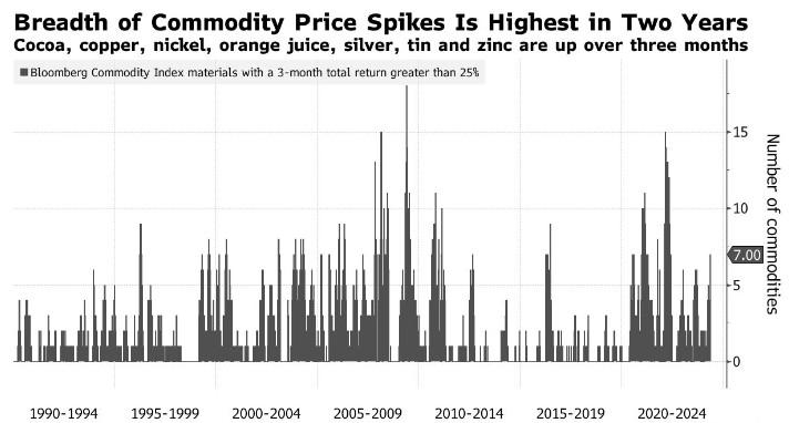 由于供应紧张、需求飙升,甚至一些投机活动,今年大宗商品价格连续上涨。根据计算,彭博商品指数中34种原材料在三个月内的总回报率至少为25%,这是自2022年年中以来的最高水平。回报率强劲的原材料包括可可、铜、镍、橙汁、银、锡和锌。工业金属价格相对普遍的上涨值得注意,并引发了另一个问题,即未来通胀前景的担忧。