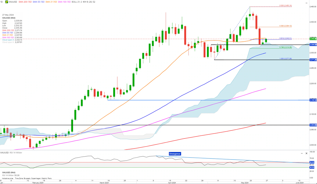 Larsson写道:“黄金似乎正在从斐波那契0.618和0.786回撤位之间的区间(下图阴影部分),以及2326美元附近的支撑位反弹。在反弹之前,仍有可能跌至斐波那契0.786的回调位2314美元。”