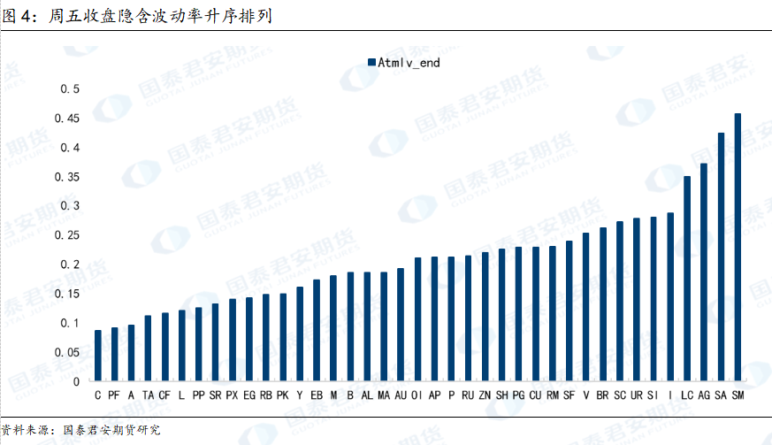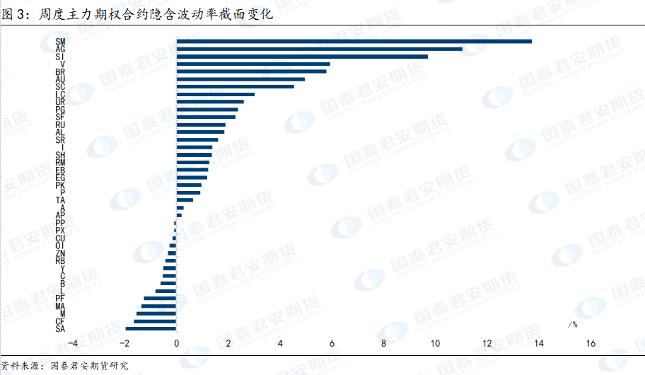 从波动率上来说,整体成交量加权波动率上涨0.12%,能化上涨1.19%,金属上涨0.9%,黑色上涨0.29%,农产品下跌0.03%。其中锰硅期权和白银期权波动率继续上涨,工业硅期权升波程度排名靠前,纯碱、棉花和豆粕的期权波动率下降明显。