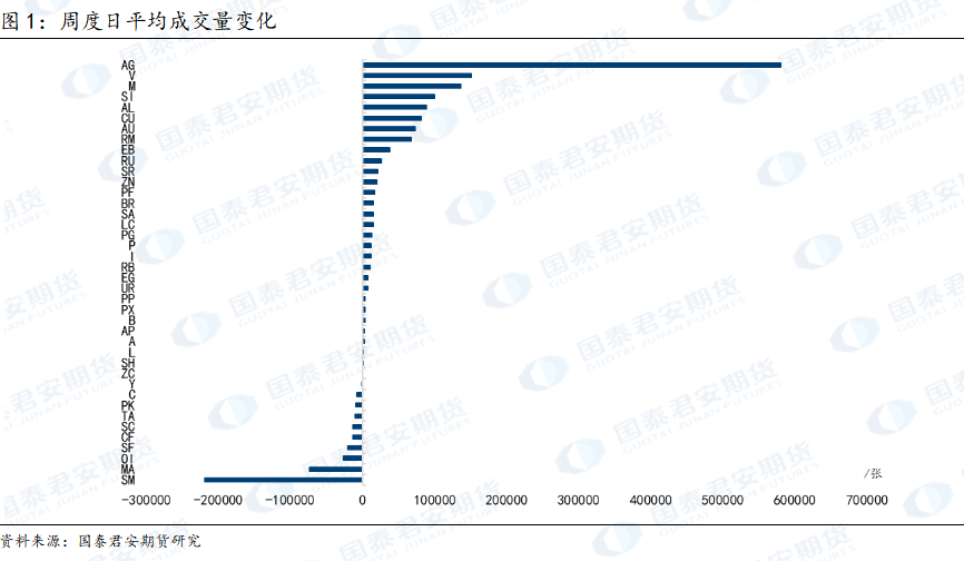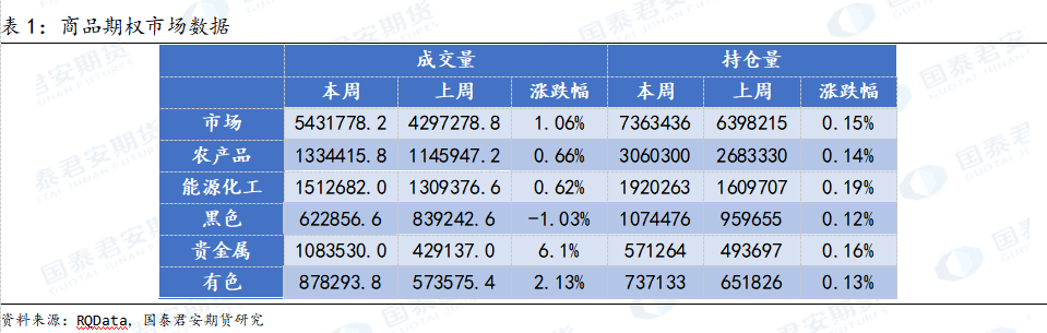 过去一周,商品期权整体成交持仓量进一步上涨。分板块来看,贵金属和有色板块的期权成交量涨幅最大,黑色板块期权成交量有所下降,能化板块增仓最大。