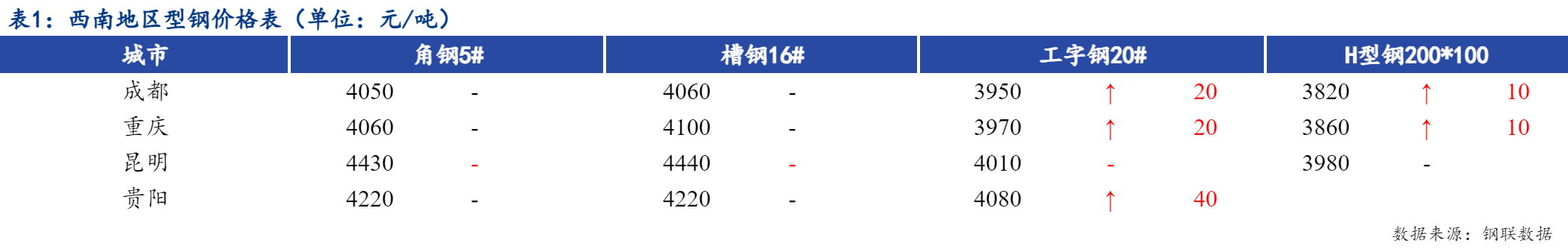 成都与重庆角钢价差不变,工字钢价差不变,H型钢价差不变;昆明和贵阳角钢价差不变,工字钢价差价差不变。