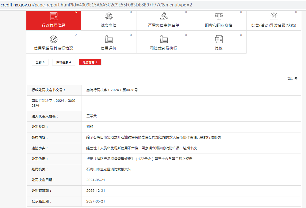 石嘴山市宝塔龙升石油销售有限责任公司加油站被罚款5100元