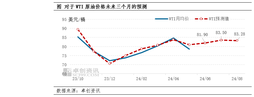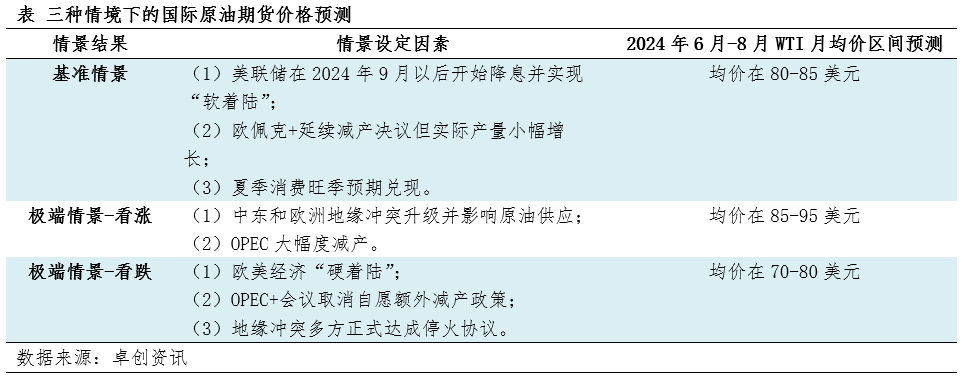对于后三个月的WTI月均价,基准情境下:如果美联储9月以后降息的同时实现经济“软着陆”,欧佩克+延续减产决议但实际产量小幅增长、美国原油产量保持高位、夏季消费旺季兑现,且地缘冲突未波及原油供应,那么多因子模型预计未来三个月WTI月均价将会在2024年6月81.90美元/桶,7月83.50美元/桶,8月83.28美元/桶。